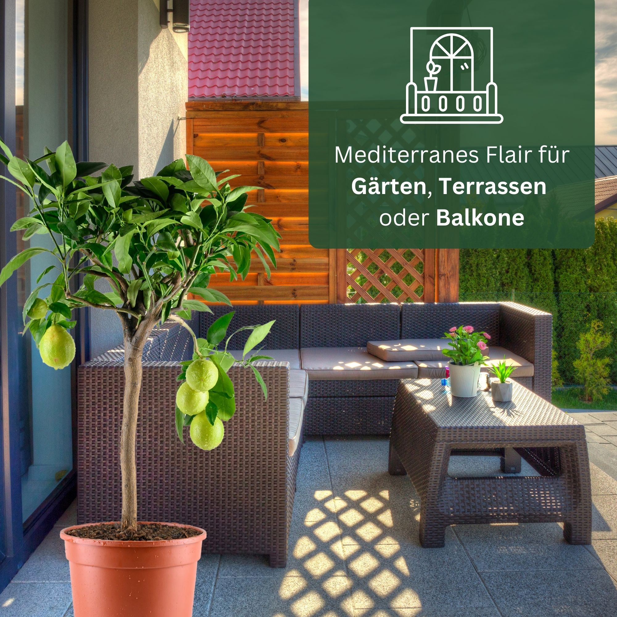 Der Amalfi Zitronenbaum bringt mediterranes Flair und sonnige Lebensfreude direkt zu Ihnen nach Hause. Mit seinem dichten, glänzend grünen Laub, den duftenden weißen Blüten und den großen, aromatischen Früchten ist er ein echter Blickfang auf Balkon, Terrasse oder im Wintergarten. Die Sorte Sfusato Amalfitano zählt zu den beliebtesten Zitronenarten überhaupt – bekannt für ihre dicke, aromatische Schale und ihr mild-säuerliches Fruchtfleisch. Besonders schön ist die Tatsache, dass der Baum mehrmals im Jahr blüht und dabei häufig Blüten und Früchte gleichzeitig trägt – ein wunderbarer Anblick und ein herrlicher Duft. Der Amalfi Zitronenbaum ist eine immergrüne, mehrjährige Pflanze, die bei richtiger Pflege viele Jahre vital bleibt und regelmäßig Früchte trägt. Er bevorzugt sonnige, geschützte Standorte und eignet sich hervorragend als Kübelpflanze für Balkon oder Terrasse. Besonderheiten:🌸 Starker Blütenduft – erinnert an mediterrane Sommernächte🍋 Große, ovale Früchte mit intensivem Zitronenaroma💚 Ideal für Liebhaber mediterraner Pflanzen🕰️ Langlebig und robust bei richtiger Pflege