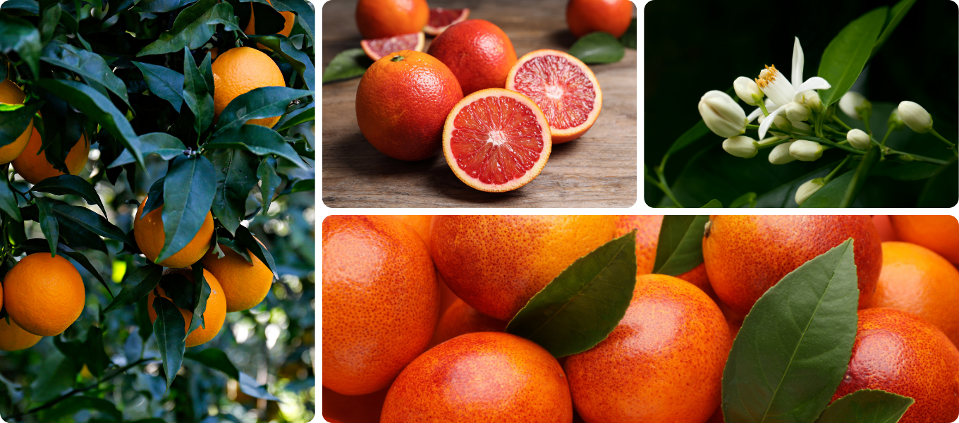 Die Früchte reifen zu leuchtend orange-roten Blutorangen mit tiefrotem, saftigem Fruchtfleisch heran, das reich an Aroma und natürlichen Antioxidantien ist.