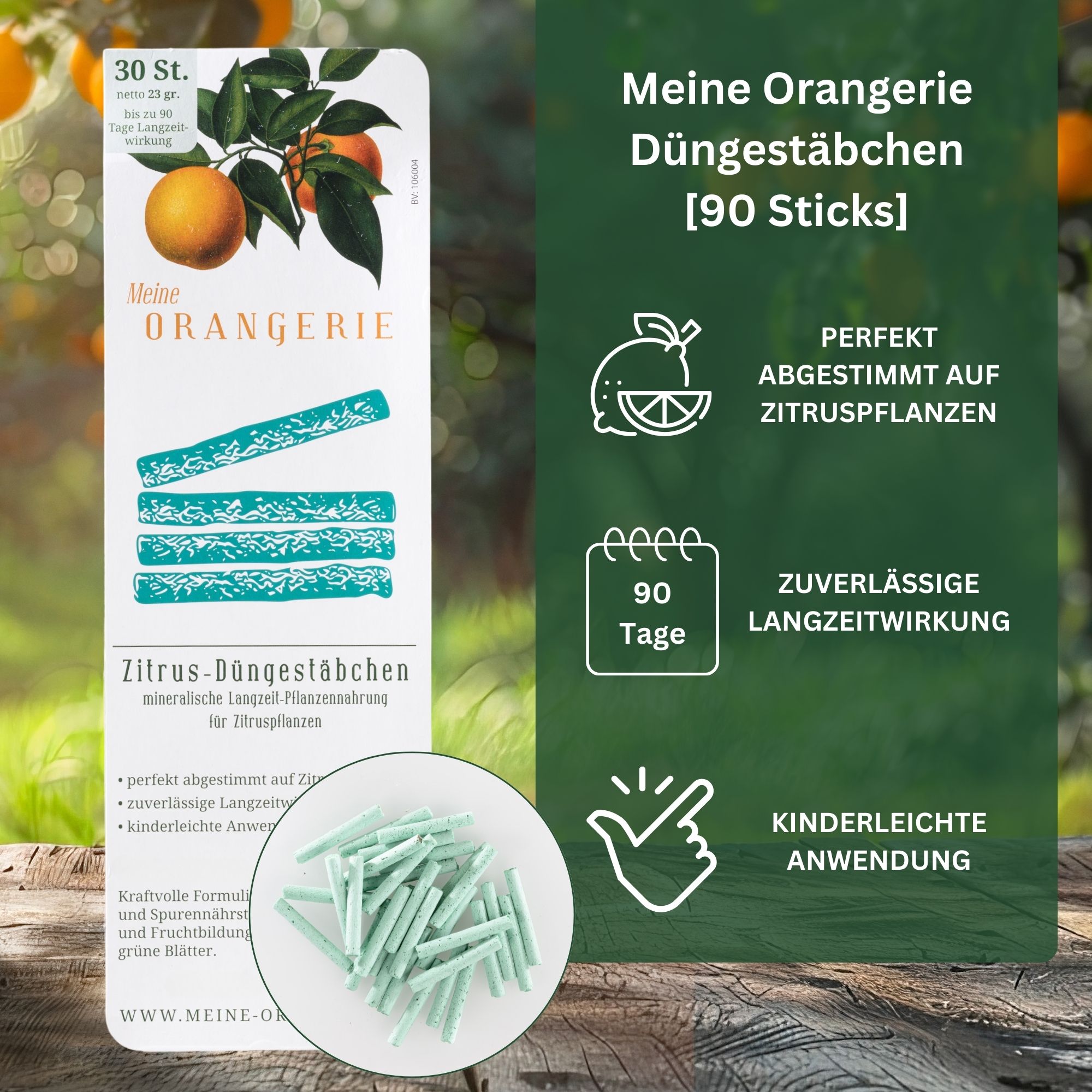 Zitrus-Düngestäbchen mineralische Langzeit-Pflanzennahrung für Zitruspflanzenbis zu 90 Tage Langzeitwirkungperfekt abgestimmt auf Zitruspflanzenzuverlässige Langzeitwirkungkinderleichte AnwendungEigenschaften: Kraftvolle Formulierung mit allen Haupt- und Spurennährstoffen für gute Blüten- und Fruchtbildung sowie gesunde, grüne Blätter.Aufwandmenge für Zitruspflanzen: Topfdurchmesser bis (cm) | 15 | 25 | 35 | 45 | Anzahl Stäbchen | 3 | 5 | 8 | 12 |Anwendung:Stäbchen zwischen Topfrand und Pflanze vollständig in die Erde stecken. Bei größeren Töpfen müssen die Stäbchen gleichmäßig verteilt werden. Anschließend wie gewohnt gießen. Frisch umgetopfte Pflanzen nach 3 Wochen erstmalig düngen.Zusammensetzung: 15,0 % N Gesamtstickstoff 2,5 % N Ammoniumstickstoff 5,8 % N Crotonylidenharnstoffstickstoff 6,7 % N Methylenharnstoff 2,50 % N nur in warmem Wasser löslicher Methylenharnstoff-N 2,45 % N nur in kaltem Wasser löslicher Methylenharnstoff-N 5,0 % P2O5 neutral-ammoncitratlösliches und wasserlösliches Phosphat 4,4 % P2O5 wasserlösliches Phosphat 8,0 % K2O wasserlösliches Kaliumoxid 2,0 % MgO wasserlösliches Magnesiumoxid 7,0 % wasserlöslicher Schwefel 0,020 % Cu wasserlösliches Kupfer 0,100 % Fe wasserlösliches Eisen 0,050 % Mn wasserlösliches Mangan 0,005 % Mo wasserlösliches Molybdän 0,040 % Zn wasserlösliches ZinkAusgangsstoffe: Harnstoff, Methylenharnstoff, Crotonylidenharnstoff, Magnesium-, Ammonium- und Kaliumsulfat, Monoammoniumphosphat, Borsäure, Kupfer-, Zink-, Eisen- und Mangansulfat, Natriummolybdat, Ca-Bentonit, synthetische Polymere als Bindemittel, Farbstoff Farbe: grün