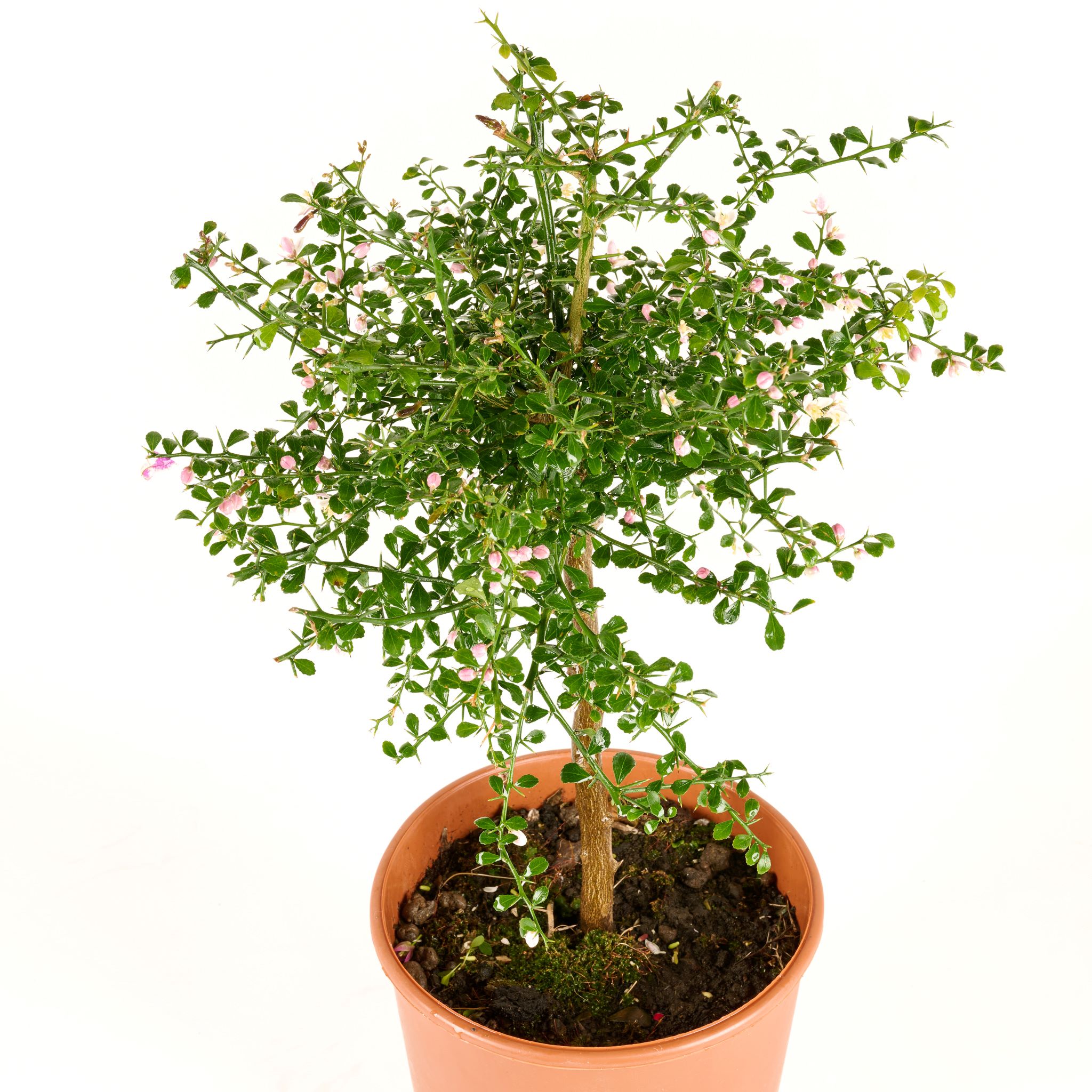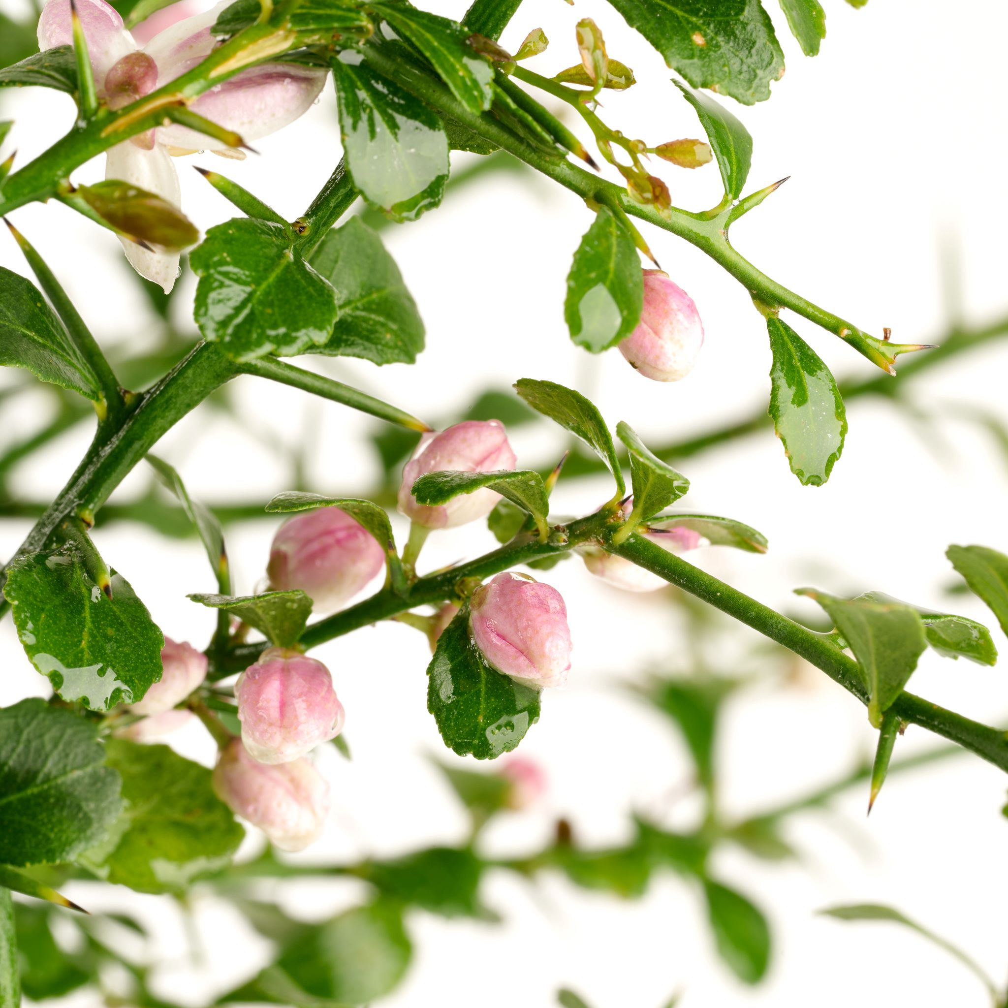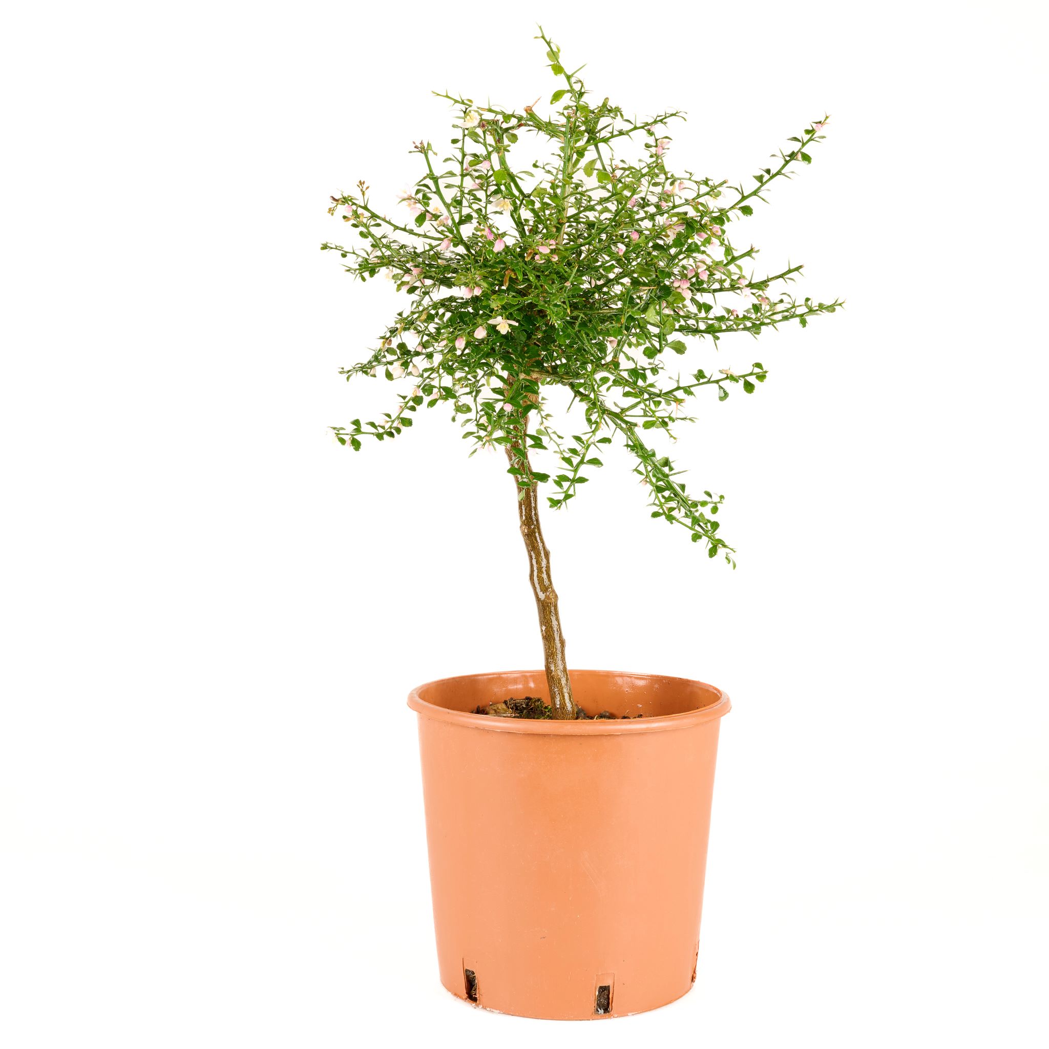 Die Pflanze wächst kompakt und dicht verzweigt, mit vielen kleinen, rundlichen, dunkelgrünen Blättern und typischen feinen Dornen. Ihre elegante Form und ihr feines Laub machen sie zu einem exotischen Blickfang – sowohl im Topf als auch im Wintergarten.