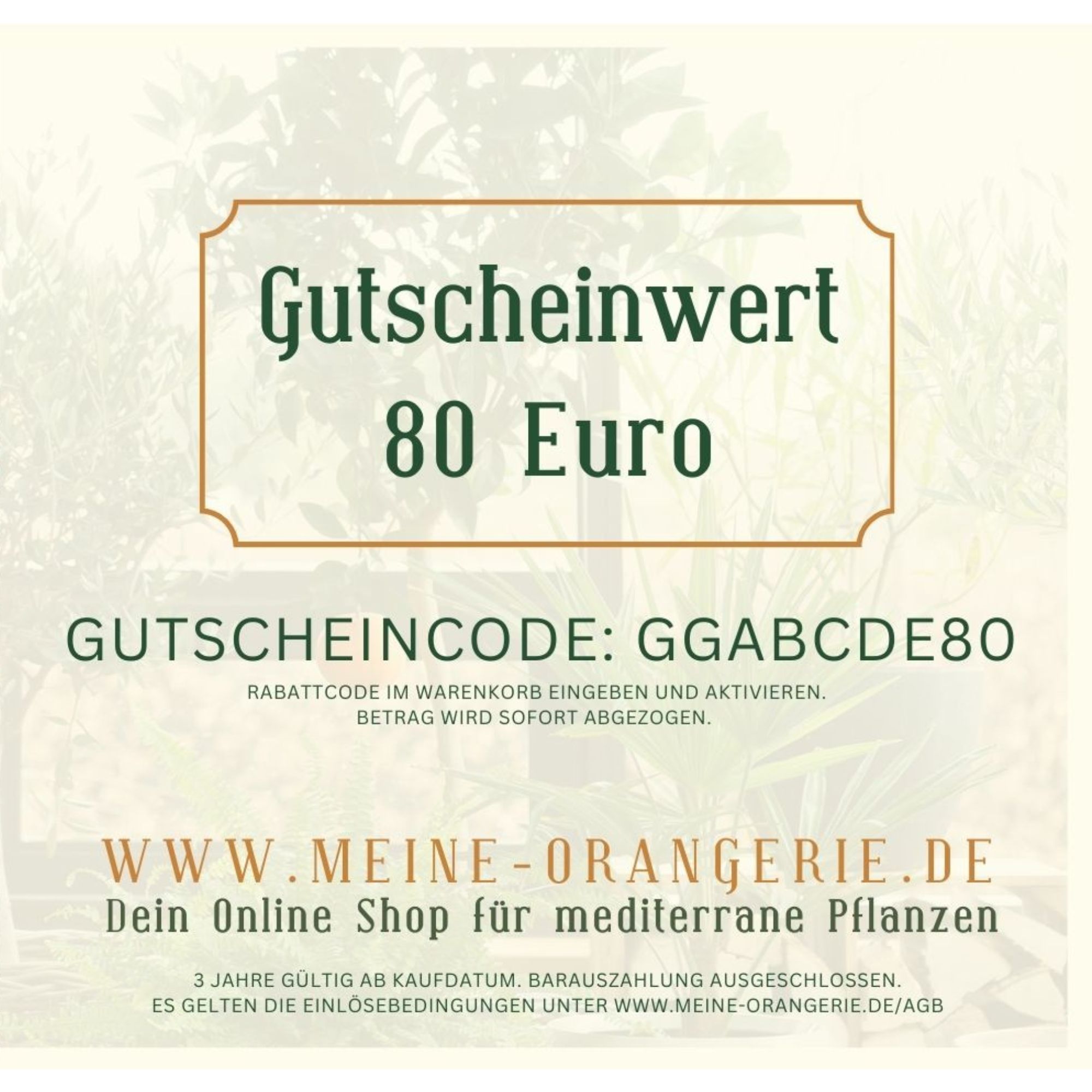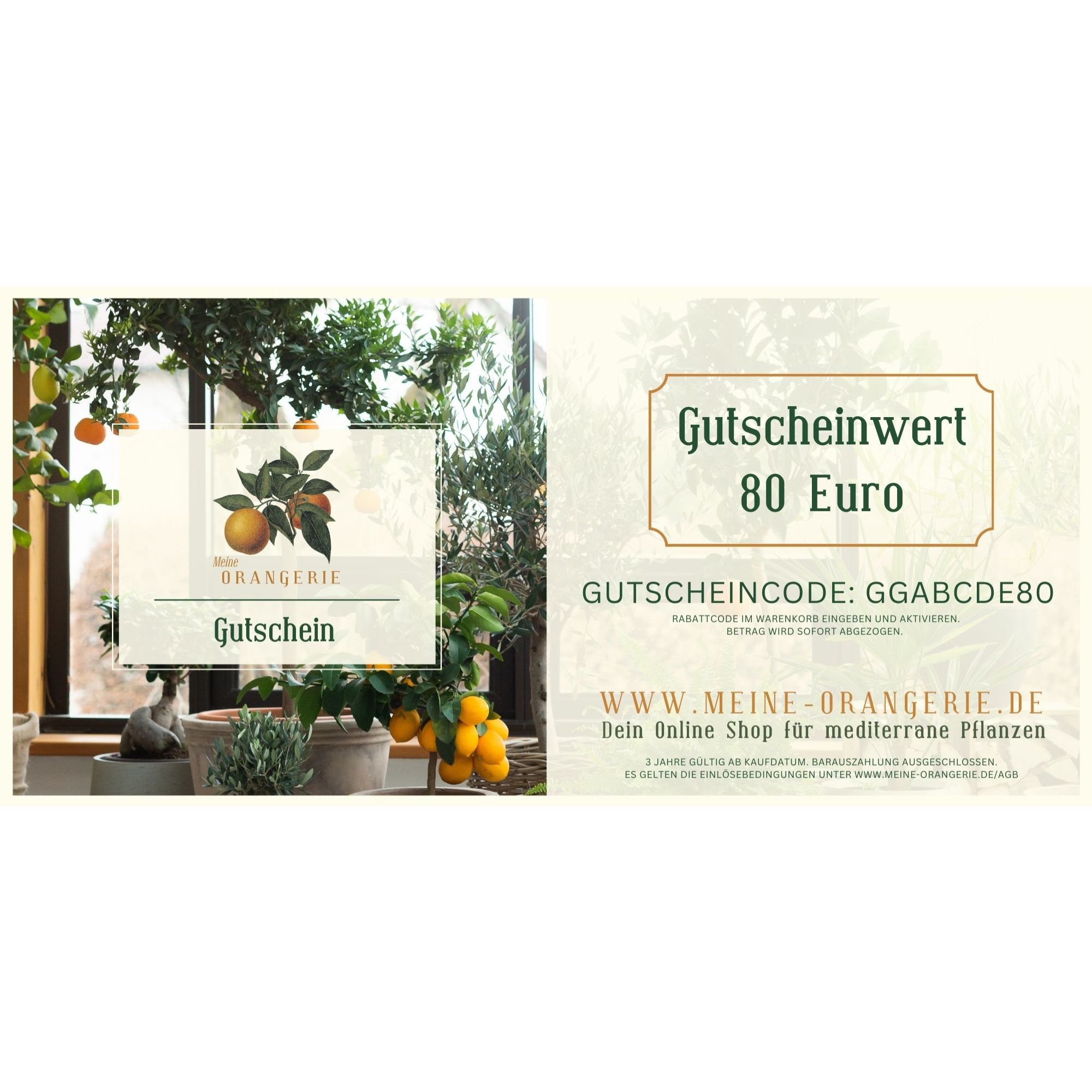 Der Gutschein kann im Onlineshop auf unser gesamtes Sortiment eingelöst werden – von Zitronenbäumen, Orangen und Kumquats bis hin zu Olivenbäumen, mediterranen Blühpflanzen und Zubehör.