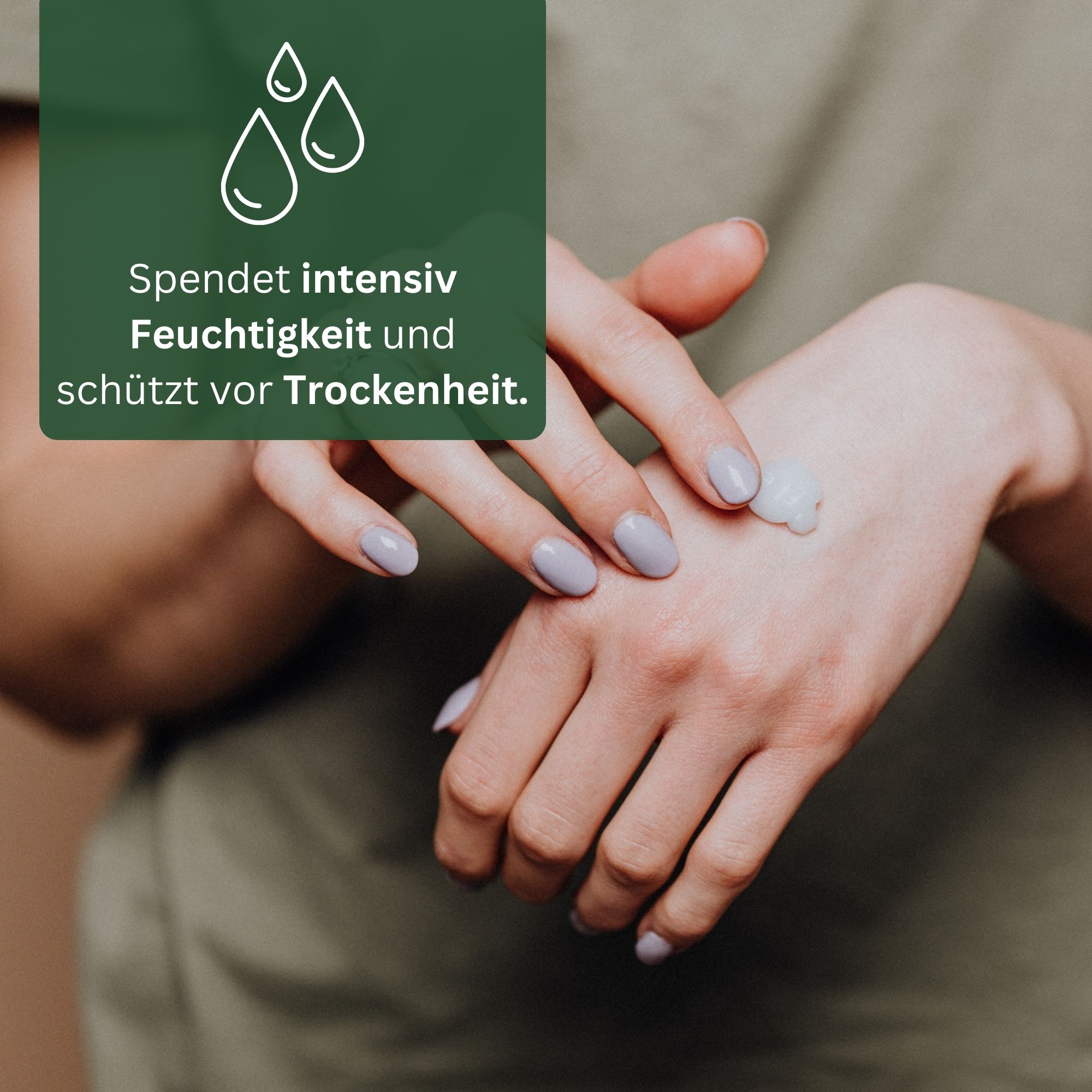 Tragen Sie die Creme auf die sauberen und gut getrockneten Hände auf und führen Sie eine intensive Massage in Richtung des Handgelenks sowohl auf dem Rücken als auch auf der Handfläche durch. Tun Sie dies mehrmals täglich, insbesondere nach Kontakt mit Reinigungsmitteln, Reizstoffen oder Wasser.