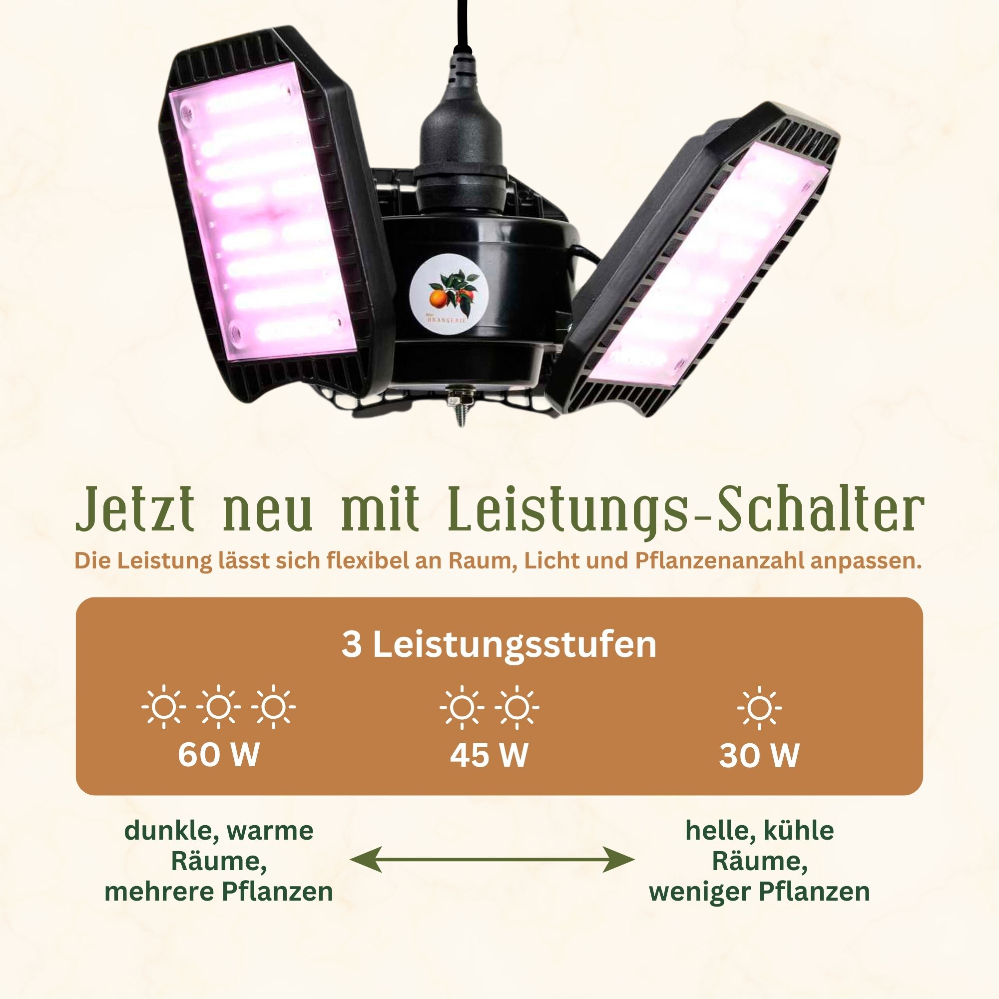 Dank integriertem Leistungs-Schalter lässt sich die Wattzahl individuell an die vorhandenen Bedingungen anpassen – ideal für helle oder dunklere Standorte sowie unterschiedliche Pflanzenanzahlen. So erhalten Ihre Pflanzen genau so viel Licht, wie sie tatsächlich benötigen.