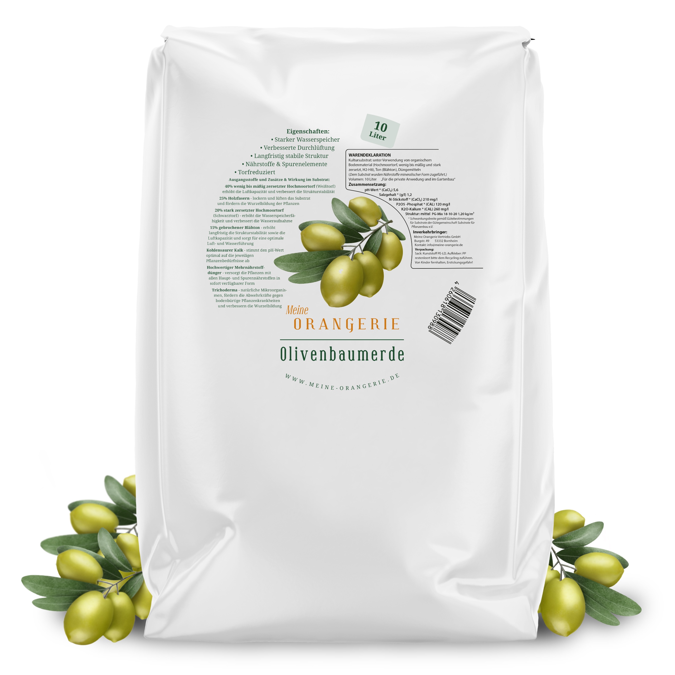 Unsere Spezialerde für anspruchsvolle OlivenbäumeInhalt: [4 x 10l = 40 l] Grundpreis pro Liter: 0,57 € inkl. MwStSTARKER WASSERSPEICHER - Nicht zu viel und nicht zu wenig! Unsere Erde für Olivenbäume speichert die richtige Menge an Wasser, ohne Staunässe an den Wurzeln. Überflüssiges Wasser läuft gut ab. VERBESSERTE DURCHLÜFTUNG - Wurzeln von Olivenbäumen benötigen Lufttaschen in der Kübelerde um sich optimal zu entwickeln. Holzfasern lockern und lüften das Substrat und fördern das Wurzelwachstum. LANGFRISTIG STABILE STRUKTUR - Olivenbaumerde braucht dauerhafte Strukturstabilität. Die spezielle Rezeptur unserer Kübelpflanzenerde bietet dies trotz reduzierten Torfanteils. NÄHRSTOFFE & PH-WERT - Die Olivenbaum-Erde ist mit kohlensaurem Kalk, natürlichen Mikro-Organismen und hochwertigem Mehrnährstoff-Dünger perfekt abgestimmt auf Ihre mediterranen KübelpflanzenGESUNDES LAUB & MEHR FRÜCHTE - Hochwertige Pflanzerde für Olivenbäume sorgt für gesunde Wurzeln und bessere Nährstoffversorgung für grüne Blätter und mehr Früchte.Ausgangsstoffe und Zusätze & Wirkung im Substrat 40% Wenig bis mäßig zersetzter Hochmoortorf (Weißtorf) - erhöht die Luftkapazität und verbessert die Strukturstabilität 25% Holzfasern - lockern und lüften das Substrat und fördern die Wurzelbildung der Pflanzen 20% Stark zersetzter Hochmoortorf (Schwarztorf) - erhöht die Wasserspeicherfähigkeit und verbessert die Wasseraufnahme 15% Gebrochener Blähton - erhöht langfristig die Strukturstabilität sowie die Luftkapazität und sorgt für eine optimale Luft- und Wasserführung Kohlensaurer Kalk - stimmt den pH-Wert optimal auf die jeweiligen Pflanzenbedürfnisse ab Hochwertiger Mehrnährstoffdünger - versorgt die Pflanzen mit allen Haupt- und Spurennährstoffen in sofort verfügbarer Form Trichoderma - natürliche Mikroorganismen. Fördern die Abwehrkräfte gegen bodenbürtige Pflanzenkrankheiten und verbessern die Wurzelbildung Warendeklaration: Kultursubstrat: unter Verwendung von organischem Bodenmaterial (Hochmoortorf, wenig bis mäßig und stark zersetzt, H2-H8), Ton (Blähton), DüngemittelnVolumen: 10 LiterInverkehrbringer: Meine Orangerie Vertriebs GmbH – Burgstr. 49 – 53332 BornheimRezeptur:pH-Wert * (CaCl2): 5,6Salzgehalt * (g/l) 1,2N-Stickstoff * (CaCl2) 210 mg/lP2O5 -Phosphat * (CAL) 120 mg/lK2O-Kalium * (CAL) 260 mg/lStruktur: mittelPG-Mix 18-10-20 1,20 kg/m³