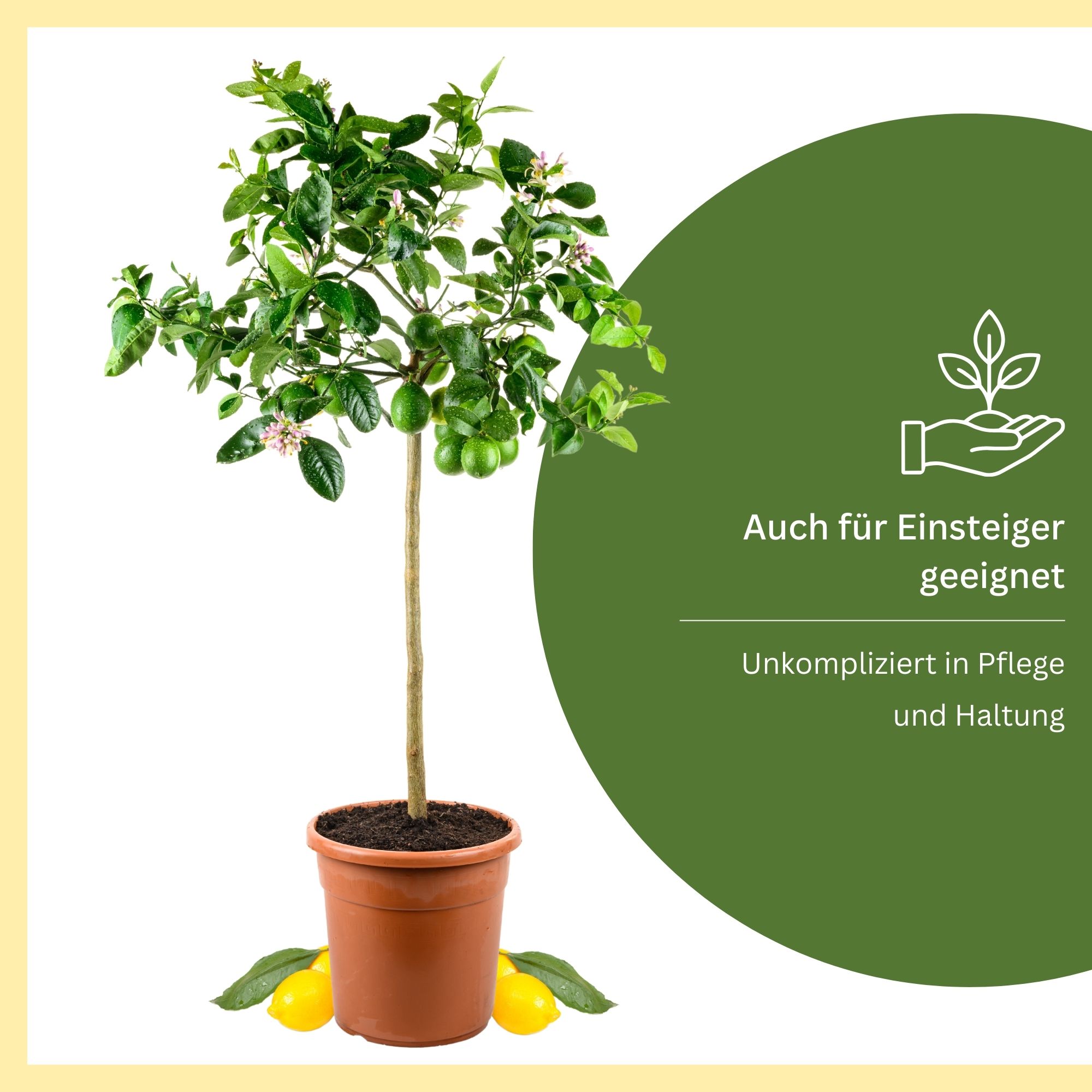 ACHTUNG: VORBESTELLUNGDIE AUSLIEFERUNG ERFOLGT IM APRIL 2026.Die Meyer-Zitrone (Citrus limon 'Meyeri') ist eine ganz besondere Zitrussorte, die den Charme der klassischen Zitrone mit der Süße der Orange verbindet. Sie entstand vermutlich als natürliche Kreuzung aus Zitrone und Mandarine oder Orange – und genau das macht sie so beliebt.Ihre Früchte sind etwas runder, dünnschaliger und aromatischer als die herkömmlicher Zitronen. Das Fruchtfleisch ist mild-säuerlich, mit einer feinen, leicht süßlichen Note – perfekt zum Kochen, Backen und für frische Getränke. Die intensiv duftenden Blüten erscheinen mehrmals im Jahr und verströmen einen süß-zitronigen Duft, der jeden Raum erfüllt.Die Meyer-Zitrone wächst kompakt und buschig, trägt zuverlässig und ist auch für Einsteiger hervorragend geeignet. Sie gilt als besonders anpassungsfähig und robust, was sie zur idealen Zitruspflanze für Balkon, Terrasse oder Wintergarten macht.Besonderheiten:🍋 Milder, süßlich-zitroniger Geschmack🌸 Stark duftende Blüten – mehrmals im Jahr💚 Kompakter, buschiger Wuchs – ideal für kleinere Standorte🌞 Sehr blühfreudig und reich tragend🕰️ Pflegeleicht, robust und ertragreich