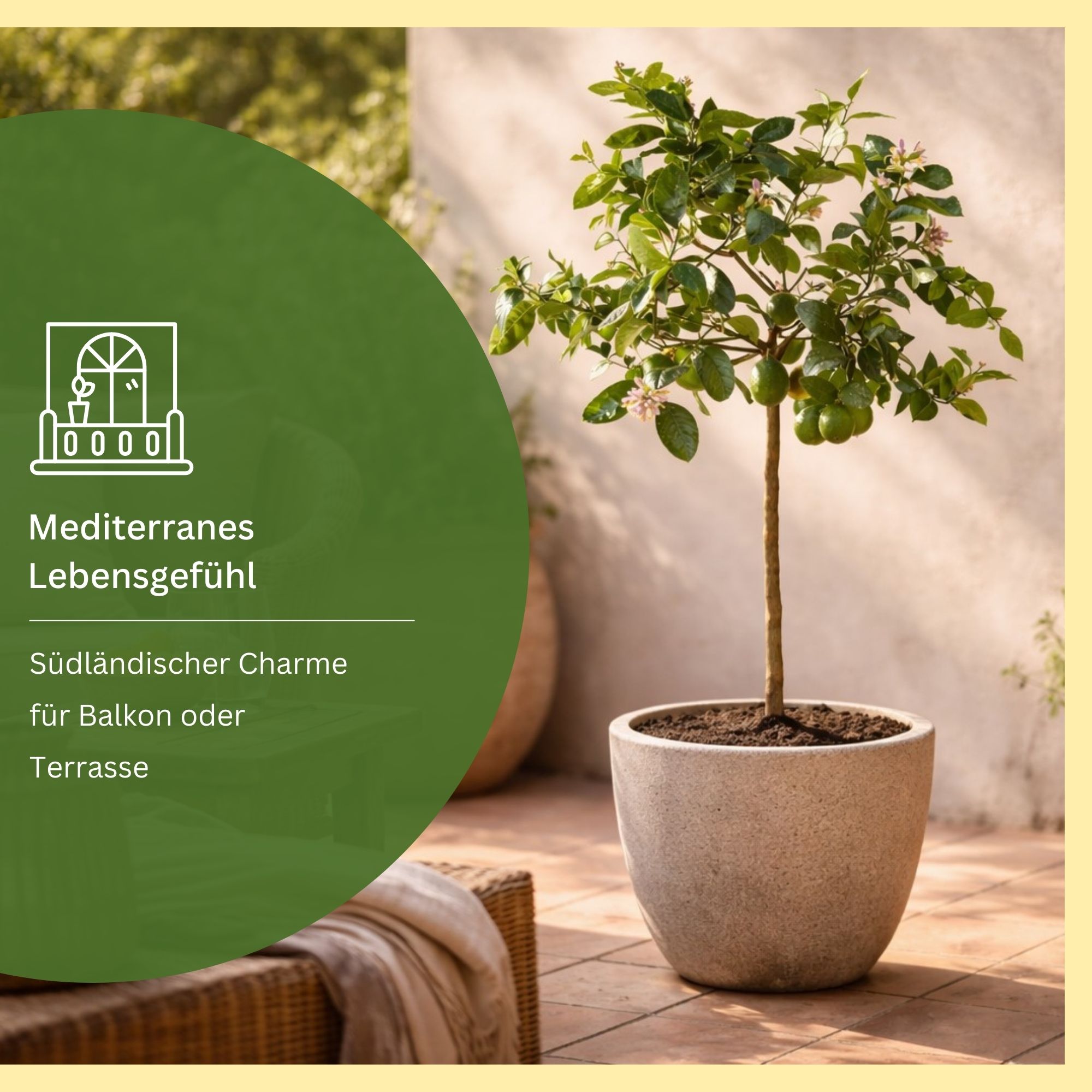 Die Meyer-Zitrone liebt Licht und Wärme. Ein vollsonniger, geschützter Standort ist ideal, um ihr volles Aroma und ihre Blühfreude zu entfalten. Auf Balkon, Terrasse oder im Garten sollte sie möglichst windgeschützt, aber gut belüftet stehen – am besten nahe einer warmen Hauswand oder unter einem Dachvorsprung.
