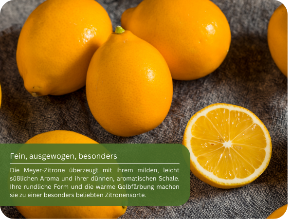 Die Meyer-Zitrone (Citrus limon 'Meyeri') ist eine ganz besondere Zitrussorte, die den Charme der klassischen Zitrone mit der Süße der Orange verbindet. Sie entstand vermutlich als natürliche Kreuzung aus Zitrone und Mandarine oder Orange – und genau das macht sie so beliebt.