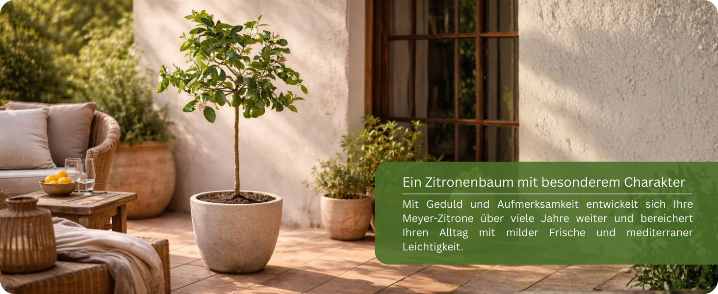 Die Meyer-Zitrone liebt Licht und Wärme. Ein vollsonniger, geschützter Standort ist ideal, um ihr volles Aroma und ihre Blühfreude zu entfalten. Auf Balkon, Terrasse oder im Garten sollte sie möglichst windgeschützt, aber gut belüftet stehen – am besten nahe einer warmen Hauswand oder unter einem Dachvorsprung.