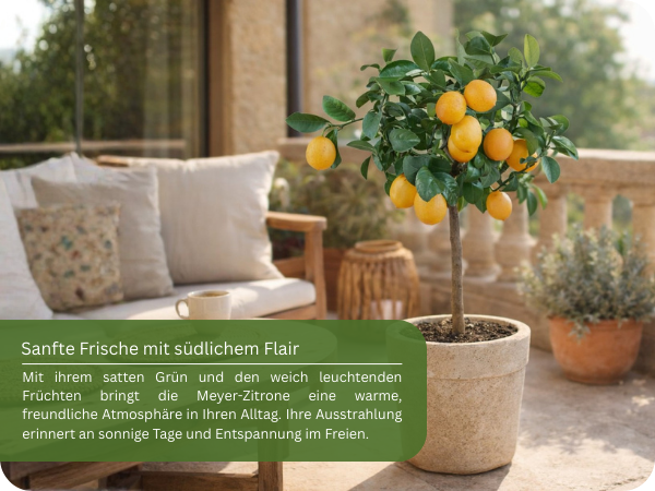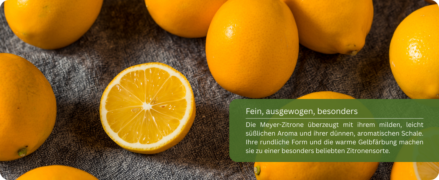 Ihre Früchte sind etwas runder, dünnschaliger und aromatischer als die herkömmlicher Zitronen. Das Fruchtfleisch ist mild-säuerlich, mit einer feinen, leicht süßlichen Note – perfekt zum Kochen, Backen und für frische Getränke. Die intensiv duftenden Blüten erscheinen mehrmals im Jahr und verströmen einen süß-zitronigen Duft, der jeden Raum erfüllt.