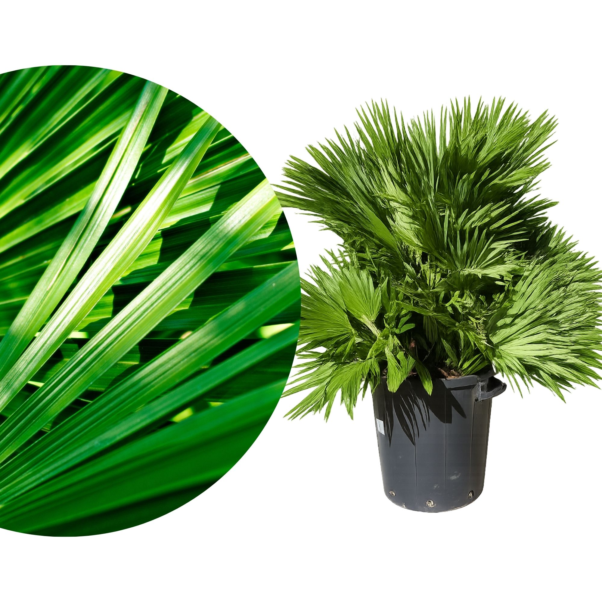 Die Chamaerops humilis ‘Siciliana’ ist eine besonders attraktive, kompakte Auslese der europäischen Zwergpalme – mediterran, robust und voller Charakter. Mit ihrem dichten, harmonischen Wuchs und den festen, fächerförmigen Blättern bringt sie sofort südliches Flair auf Terrasse, Balkon oder in den Garten.