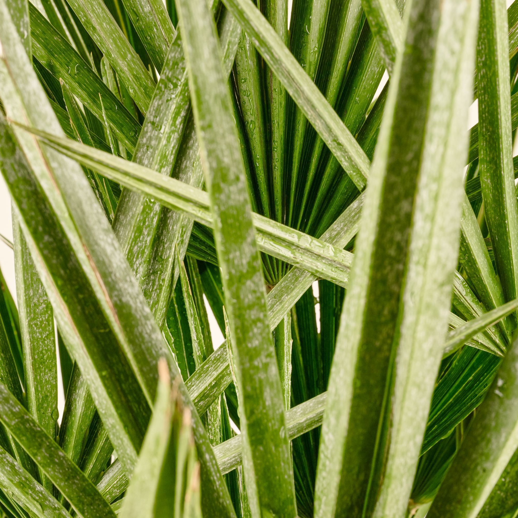 Sie wächst deutlich kompakter als andere Palmenarten und erreicht im Kübel meist eine Höhe von 1–2 Metern. Ihr natürlich dichter Wuchs und die silbrig-grünen Wedel machen sie zu einer der attraktivsten Kübelpflanzen überhaupt.