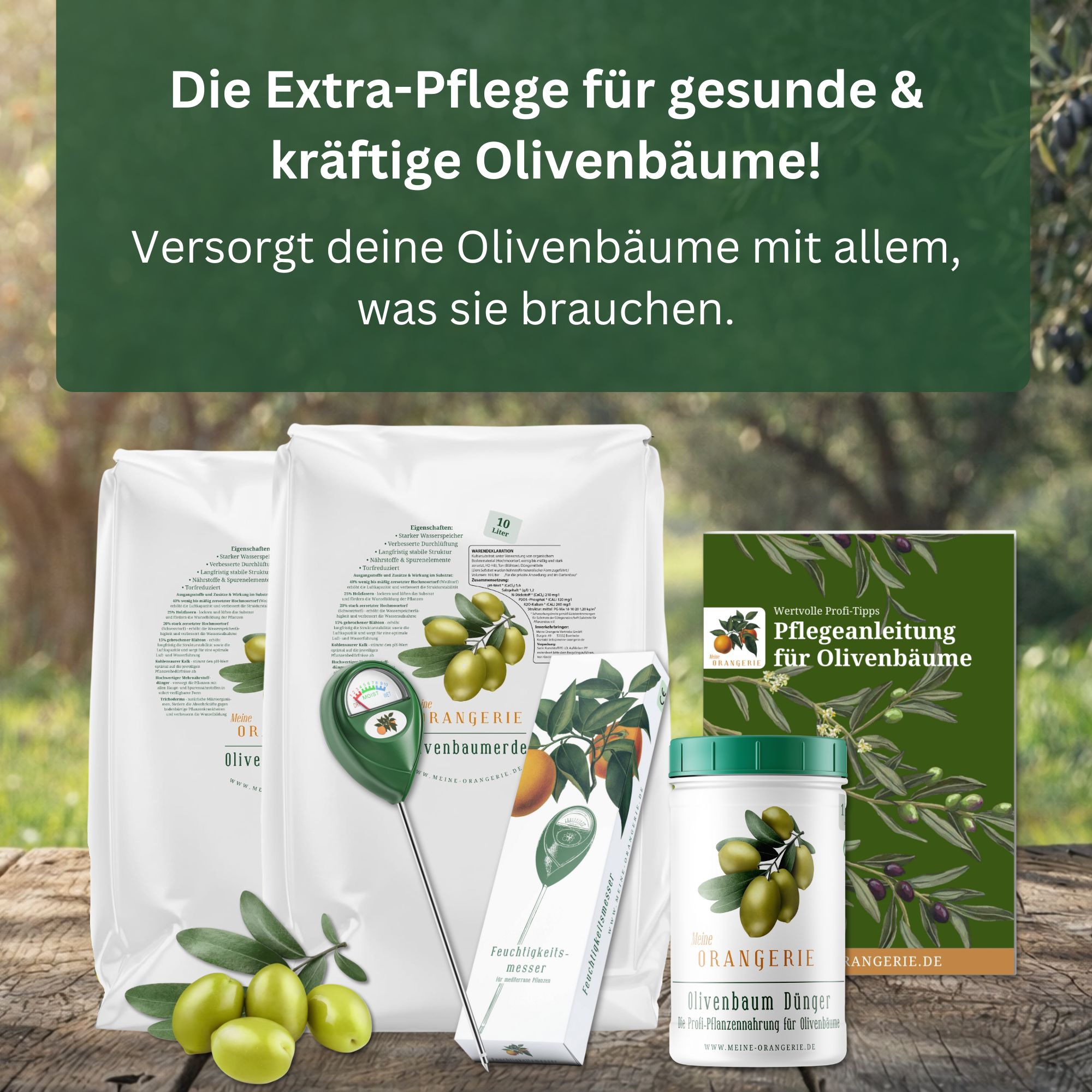 Mit unserem Olivenbaum-Pflegepaket [Piccolo] erhalten Sie die ideale Grundausstattung für die richtige Pflege Ihres Olivenbaums. Die 12-seitige Pflegebroschüre von Meine Orangerie vermittelt Ihnen kompakte, praxisnahe Pflegehinweise und viele hilfreiche Tipps rund um Ihren Olivenbaum – vom Gießen bis zur Überwinterung. Ein unverzichtbares Hilfsmittel für die richtige Wasserversorgung ist der enthaltene Feuchtigkeitsmesser. Er zeigt zuverlässig an, wann Ihr Olivenbaum Wasser benötigt. Abgerundet wird das Paket durch unseren Olivenbaumdünger von Meine Orangerie, der Ihren Baum optimal mit allen wichtigen Nährstoffen versorgt und ein gesundes Wachstum unterstützt. Mit dem Pflegepaket sind Sie bestens für die Grundversorgung Ihres Olivenbaums ausgestattet – und sparen gegenüber dem Einzelkauf. Das Pflegepaket [Piccolo] enthält: 1× Pflegebroschüre für Olivenbäume [12 Seiten] 1× Feuchtigkeitsmesser 1× Olivenbaumdünger von Meine Orangerie [1 kg]
