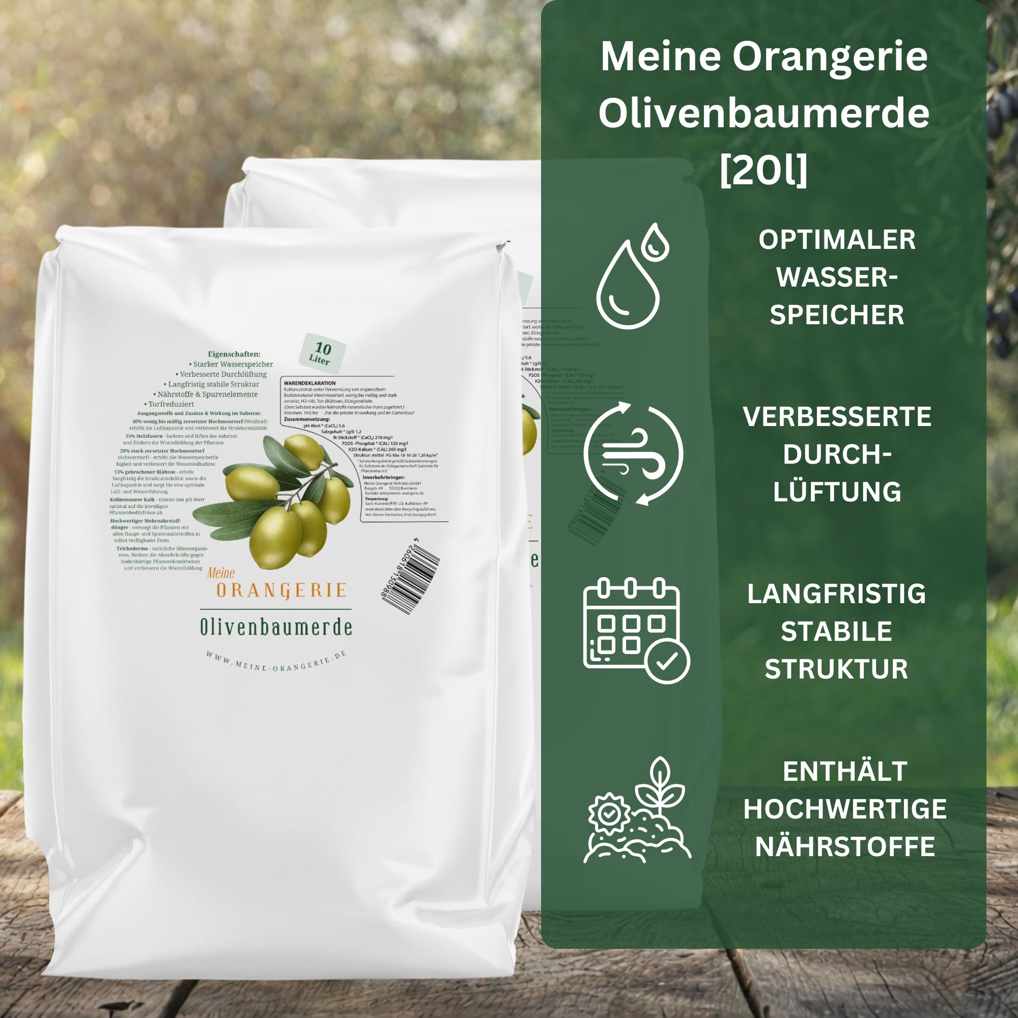 Zusätzlich enthält das Pflegepaket 20 Liter hochwertige Olivenerde von Meine Orangerie. Durch ihre strukturstabile, gut drainierende Zusammensetzung ist sie optimal auf die Bedürfnisse von Olivenbäumen abgestimmt. Die Erde eignet sich sowohl zum Umtopfen als auch zum Auffüllen des Pflanzgefäßes.