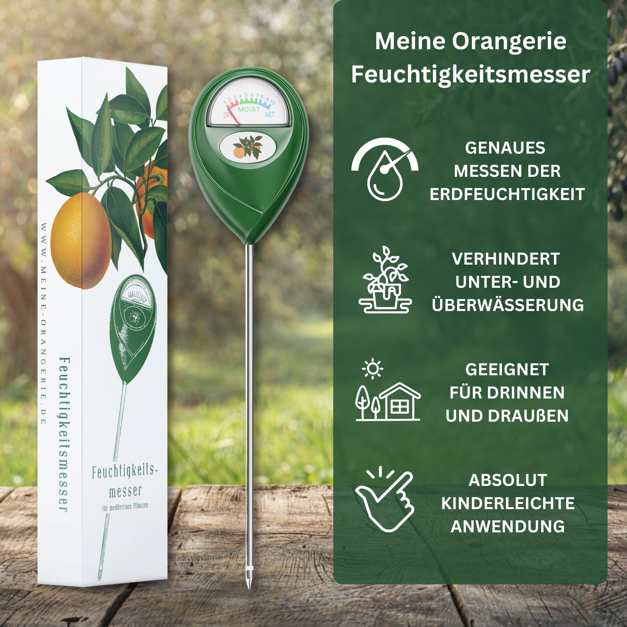 Ein unverzichtbares Hilfsmittel für die richtige Wasserversorgung ist der enthaltene Feuchtigkeitsmesser. Er zeigt zuverlässig an, wann Ihr Olivenbaum Wasser benötigt.