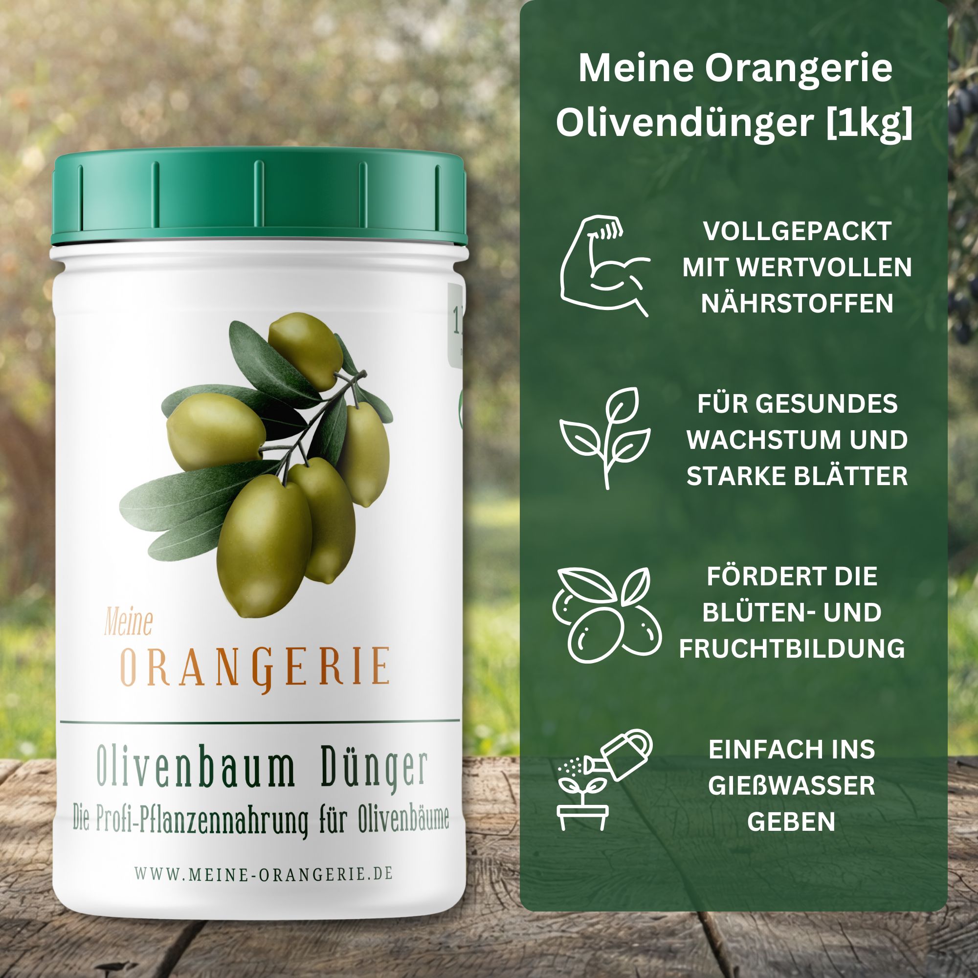 Abgerundet wird das Paket durch unseren Olivenbaumdünger von Meine Orangerie, der Ihren Baum optimal mit allen wichtigen Nährstoffen versorgt und ein gesundes Wachstum unterstützt.