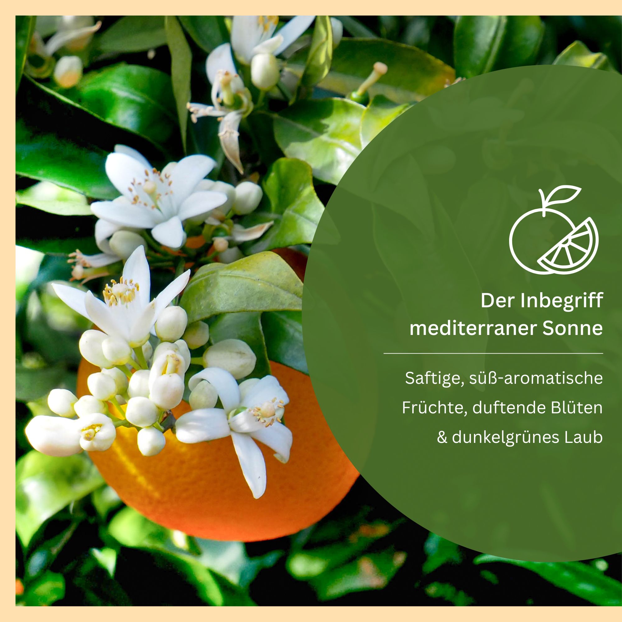 Im Frühjahr erscheinen zahlreiche duftende, weiße Blüten, die nicht nur romantisches Flair verbreiten, sondern auch die späteren Früchte ankündigen. Die süß-saftigen Orangen reifen im Laufe des Sommers heran und sind ein Genuss für Augen, Nase und Gaumen zugleich.