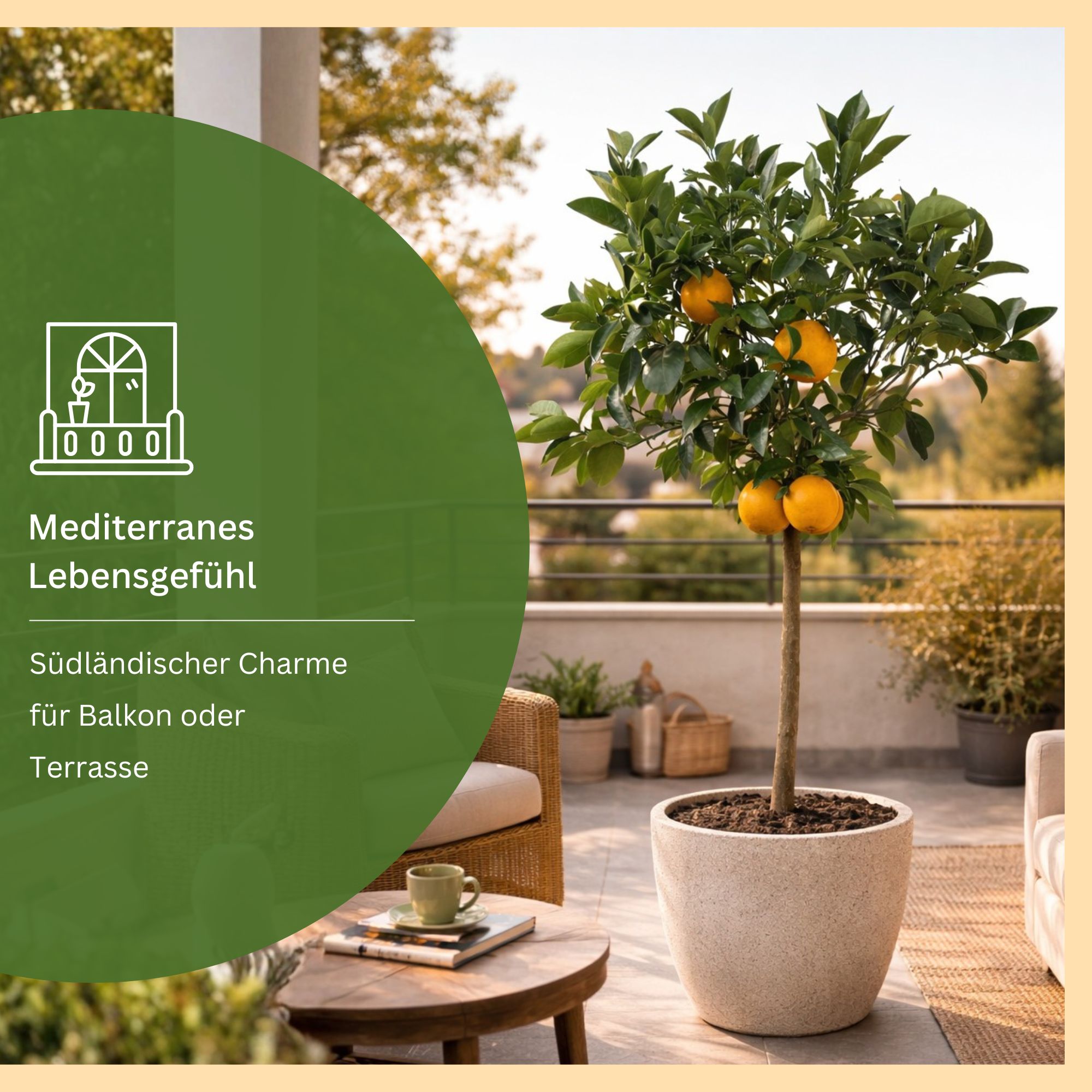 Ein stabiler Pflanztopf mit mediterranem Charakter betont die Eleganz des Baumes und bietet sicheren Halt. In unserer Pflanztopf-Kategorie finden Sie passende Modelle in klassischer oder moderner Ausführung.