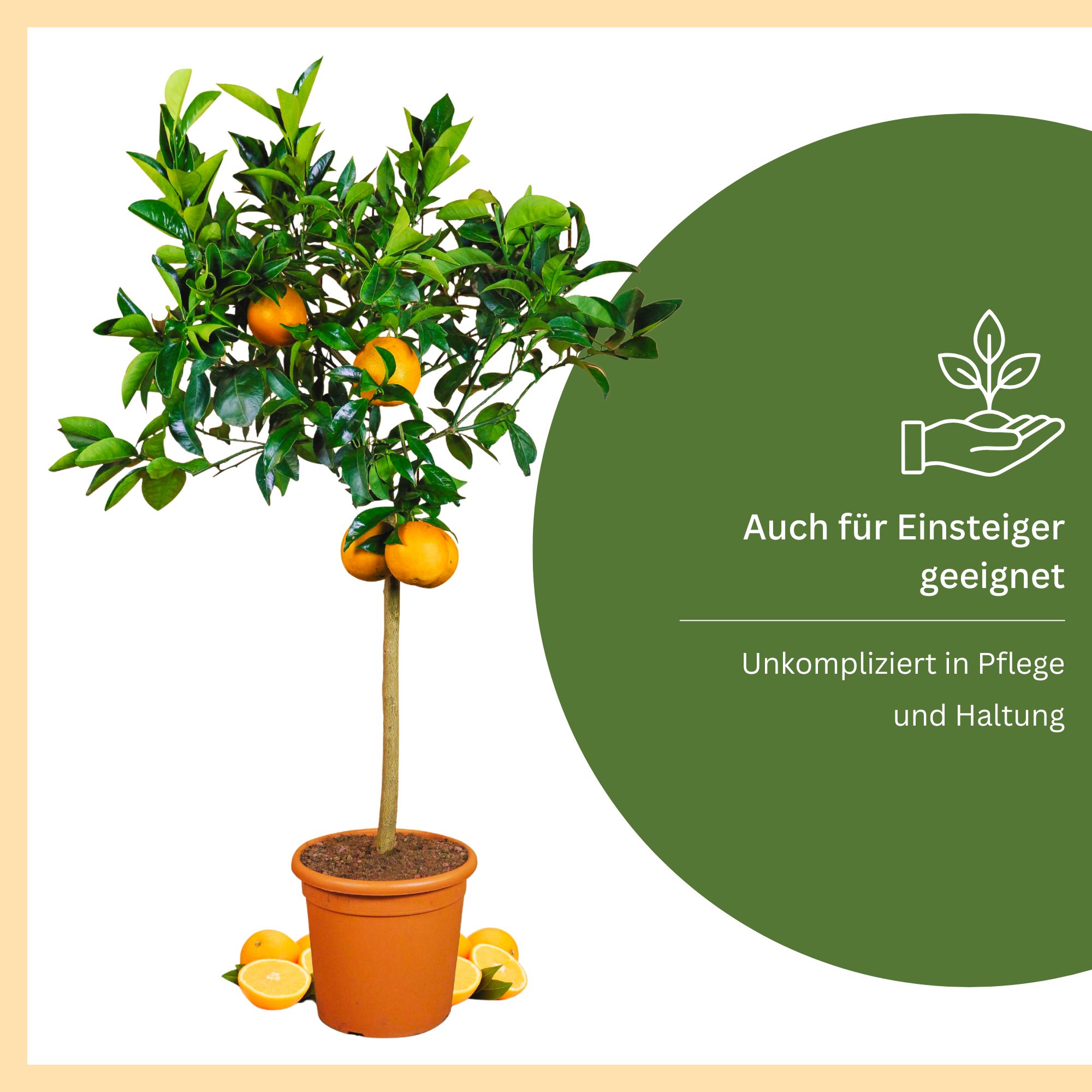 ACHTUNG: VORBESTELLUNG - DIE AUSLIEFERUNG ERFOLGT IM APRIL 2026GENAUER LIEFERTERMIN WIRD IHNEN BEKANNT GEGEBEN - TERMINABSPRACHEN MÖGLICHDer Orangenbaum (Citrus sinensis) ist eine der beliebtesten und bekanntesten Zitruspflanzen überhaupt – ein echtes Symbol mediterraner Lebensfreude. Mit seinem dichten, dunkelgrünen Laub und den leuchtend orangefarbenen Früchten ist er ein Schmuckstück für jede Terrasse, jeden Balkon oder Wintergarten.Im Frühjahr erscheinen zahlreiche duftende, weiße Blüten, die nicht nur romantisches Flair verbreiten, sondern auch die späteren Früchte ankündigen. Die süß-saftigen Orangen reifen im Laufe des Sommers heran und sind ein Genuss für Augen, Nase und Gaumen zugleich.Der Orangenbaum ist pflegeleicht, robust und dank seines harmonischen Wuchses auch für Kübelhaltung bestens geeignet. Er vereint mediterranes Ambiente, edle Optik und kulinarischen Genuss – ein Stück Süden für Ihr Zuhause.Besonderheiten:🍊 Saftige, süß-aromatische Früchte🌸 Weiße, stark duftende Blüten🌿 Dunkelgrünes, dichtes Laub – dekorativ und elegant💚 Pflegeleicht und ertragreich🌞 Symbol mediterraner Lebensfreude