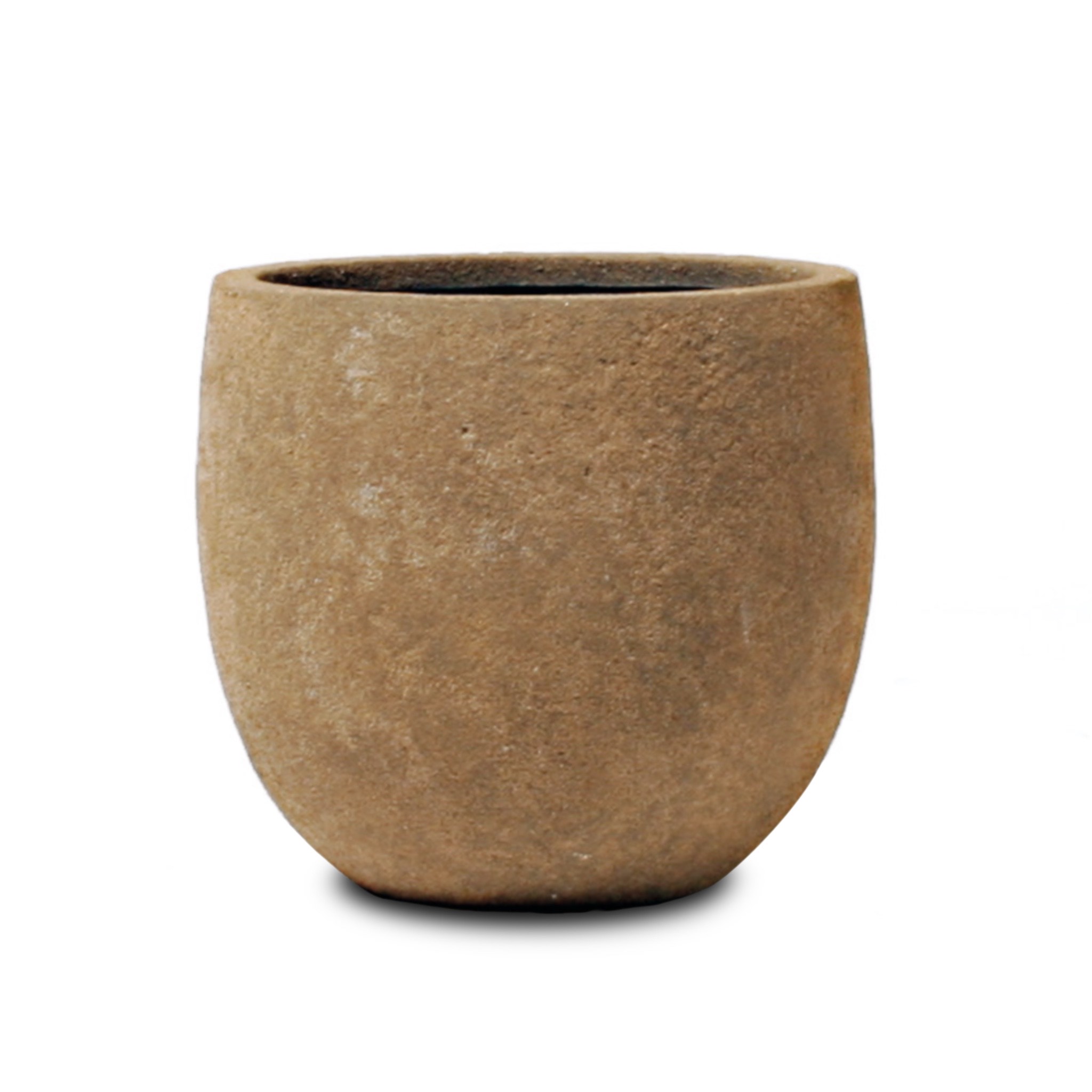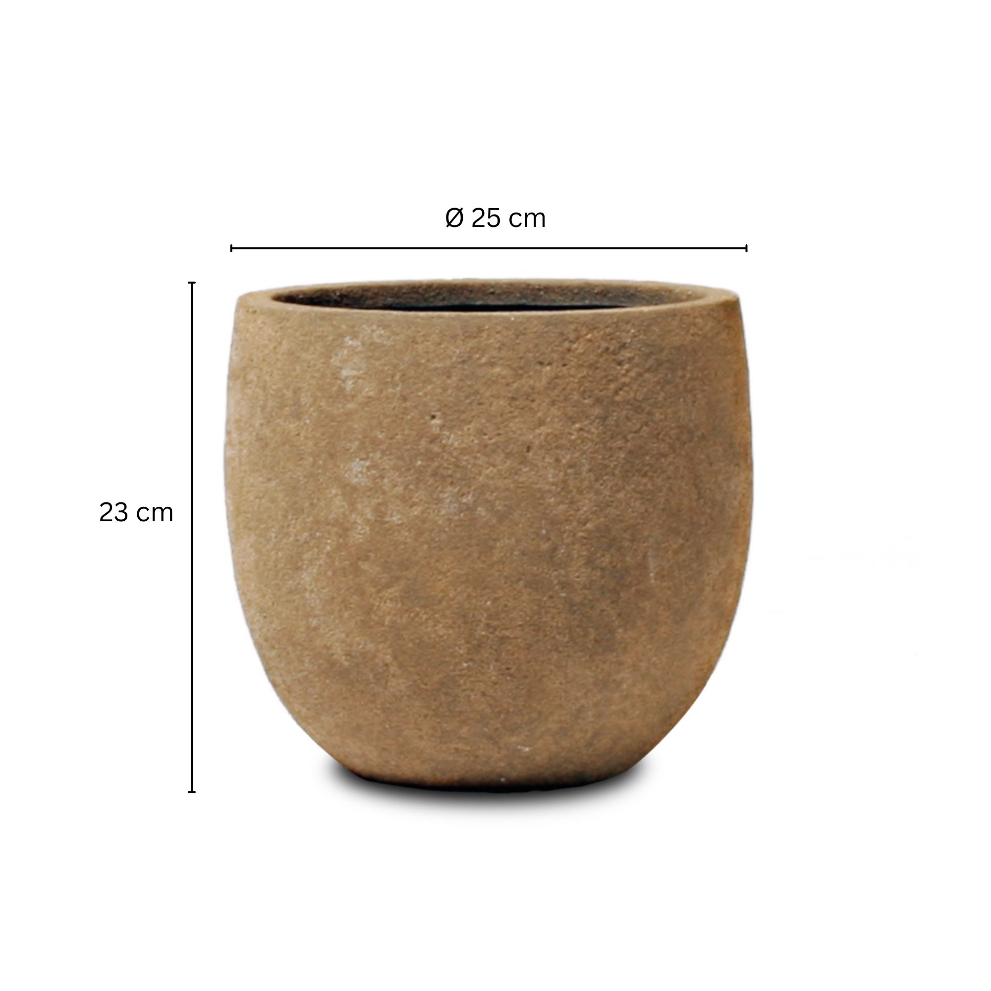 Durchmesser: 20cm - Höhe: 18cm• Glasfaserverstärkter Kunststoff• Leicht und praktisch• UV-beständig• Robust• Einzelanfertigung in Handarbeit• Raue Oberflächen• Große Standflächen mit integrierten Füßen und Bodenloch• 10-Jahre-Frostfest-Garantie bei gewährleistetem Wasserablauf