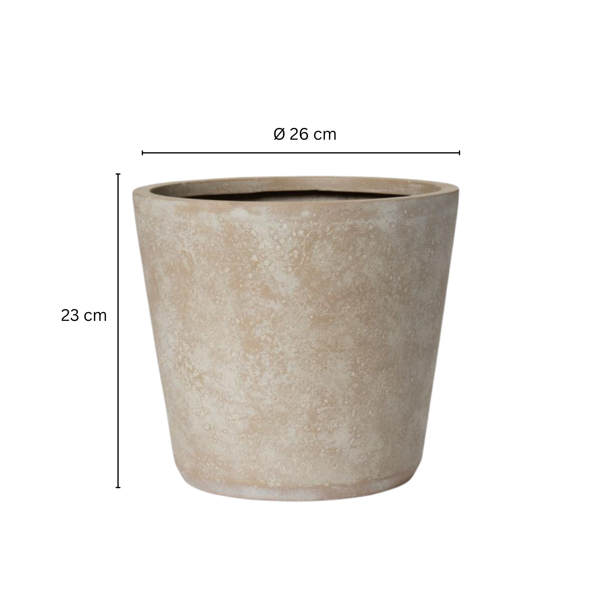 Durchmesser: 26cm - Höhe: 23cm• Glasfaserverstärkter Kunststoff• Leicht und praktisch• UV-beständig• Robust• Einzelanfertigung in Handarbeit• Raue Oberflächen• Große Standflächen mit integrierten Füßen und Bodenloch