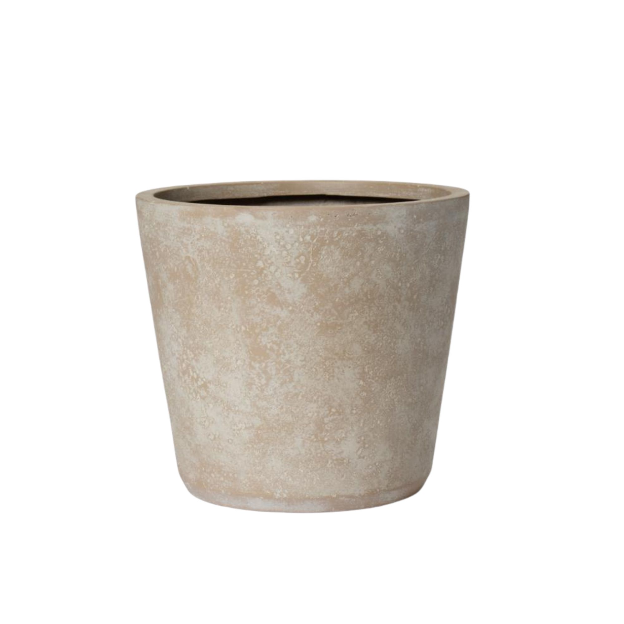 Durchmesser: 25cm - Höhe: 23cm• Glasfaserverstärkter Kunststoff• Leicht und praktisch• UV-beständig• Robust• Einzelanfertigung in Handarbeit• Raue Oberflächen• Große Standflächen mit integrierten Füßen und Bodenloch