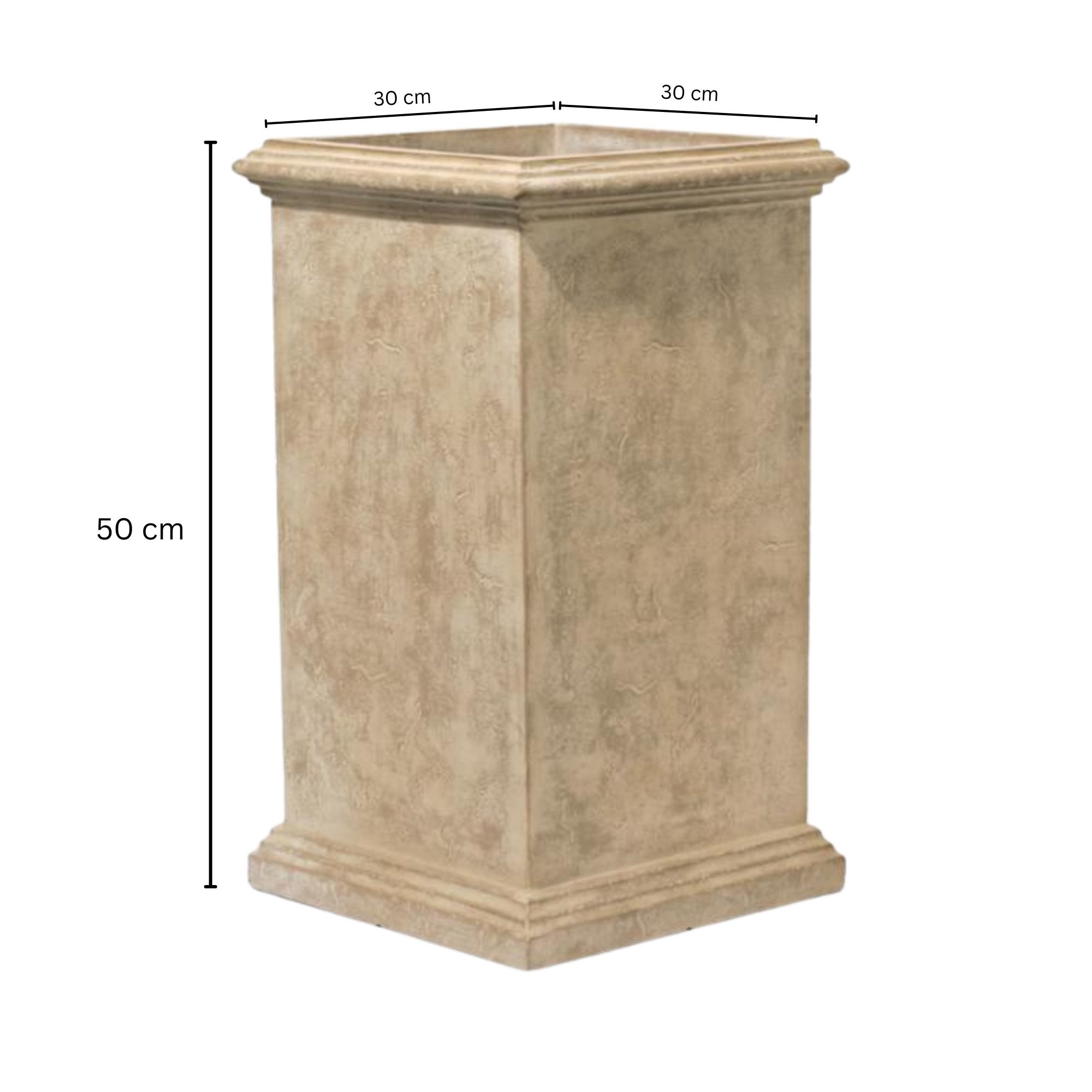 Maße: 30cm x 30cm - Höhe: 26cm• Glasfaserverstärkter Kunststoff• Leicht und praktisch• UV-beständig• Robust• Einzelanfertigung in Handarbeit• Raue Oberflächen• Große Standflächen mit integrierten Füßen und Bodenloch• 10-Jahre-Frostfest-Garantie bei gewährleistetem Wasserablauf