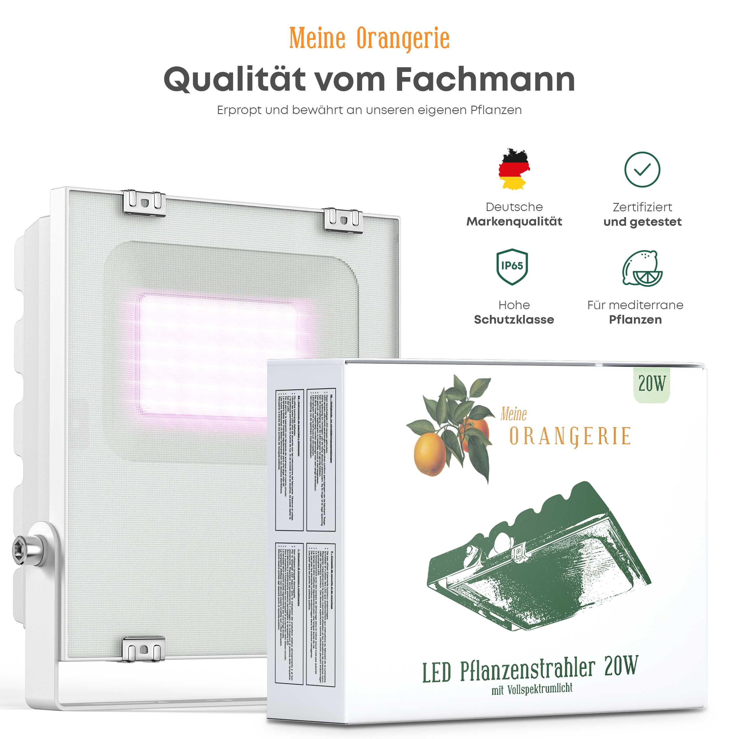 Blattverlust während der Überwinterung von mediterranen Kübelpflanzen wie z.B. Zitronen- oder Orangenbäumen ist ein regelmäßiges Problem bei der Überwinterung der Pflanzen in einer warmen Wohnung. Der Blattverlust entsteht, weil es bei Temperaturen über 10° C regelmäßig zu dunkel für die Pflanzen ist, die sehr viel Licht für die Photosynthese benötigen. Auch ein Fensterplatz kann nicht genug Licht liefern, da moderne, mehrfach verglaste Fenster zu wenig Lichtenergie durchlassen. Hier kommt die Lösung des Problems:Mit dem LED-Pflanzenstrahler erhalten Sie ein Spezialprodukt, das speziell für mediterrane Pflanzen zur Pflanzenbeleuchtung während der Überwinterung eingesetzt werden kann. Der LED-Pflanzenstrahler verfügt über einen Abstrahlwinkel von 120°. Der Pflanzenstrahler eignet sich damit bestens, um große Zitruspflanzen oder eine ganze Sammlung an kleinen und mittleren Zitruspflanzen während der Überwinterung mit Lichtenergie zu versorgen. ✔️MÜHELOSE ÜBERWINTERUNG - In unseren Pflanzenlampen steckt neueste LED-Technik für die einfache Überwinterung ihrer mediterranen Pflanzen und Zitruspflanzen. Egal ob in der Wohnstube, im Keller, in der Garage oder im Treppenhaus. ✔️ IDEALES LICHTSPEKTRUM - Die Lichtfarben der LED Pflanzenlampe Vollspektrum sind speziell auf die Bedürfnisse mediterrane und Zitruspflanzen abgestimmt. Andere Lampen erfüllen nicht die hohen Anforderungen von mediterranen Pflanzen. ✔️ MIT PFLANZENPROFIS IN DEUTSCHLAND ENTWICKELT - Unser LED Pflanzenlicht ist getestet und bewährt an tausenden mediterranen Pflanzen von Meine Orangerie Das sind die Vorteile unserer LED-Pflanzenlampen: ECHTE QUALITÄT - LED von Spezialisten in Deutschland entwickelt und getestet EXTREM SPARSAM - sehr energieeffizient und sparsam im Stromverbrauch KEINE AUFHEIZUNG - unsere LED-Dioden generieren nur wenig Wärme SEHR SICHER - Inkl. Enlüftungsventil & Blendschutzglas - enthalten kein Quecksilber oder andere giftige Substanzen DIREKT AUF 100% - leuchten sofort nach dem Einschalten mit dem vollen Lichtstrom LANGE LEBENSDAUER - sind sehr haltbar und langlebig aufgrund hochwertiger Materialien FOKUS PFLANZE - geben ein geradliniges und effektives Licht ab, dass nicht nach dem „Gießkannenprinzip“ ausleuchtet NUR VOM FEINSTEN - nur das Lichtspektrum, dass die Pflanze braucht und verwertet STECKERFERTIG UND WARTUNGSFREI - Qualitäts-LED Strahler sind kinderleicht in der Anwendung STOSSFEST & VIBRATIONSFEST - dank guter Verarbeitung HOHE SCHUTZKLASSE - IP65 - schützt die Leuchte vor Wasser und Staub Positive Beeinflussung bei der Photomorphogenese Produktmaße: Die Lampe ist 19,5cm breit und 19,3cm hoch bei einer Tiefe von 4,8cm. (Die Höhe bezieht sich nur auf die Lampe selbst. Mit dem Bügel gemessen ist sie rund 22,5cm hoch.)