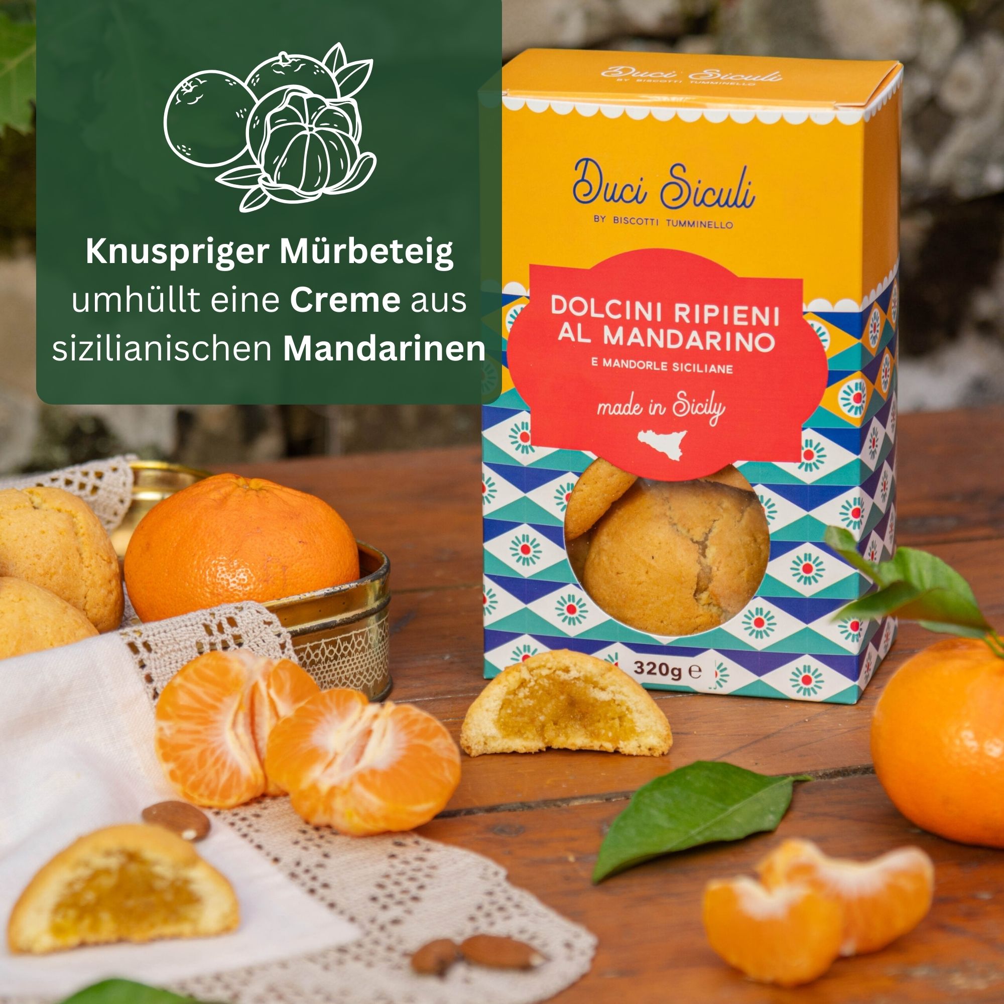 Die Dolcini al Mandarino e Mandorle von Tumminello sind die perfekte Wahl für alle, die den typisch sizilianischen Geschmack suchen. Saftige sizilianische Mandarinen und aromatische Mandeln verschmelzen zu einer weichen, duftenden Füllung, die von einem zart-knusprigen Mürbteig umhüllt wird.