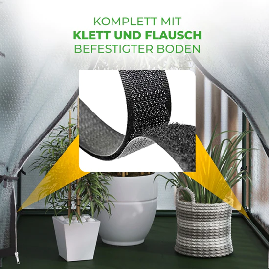 - Keine Kältebrücken: Der Boden lässt sich mit einem Klettverschluss mit Flausch dicht und fest mit dem Gewächshaus befestigen – auch wenn ein Kabel für z.B. eine Heizung ins Zelt gelegt wird.