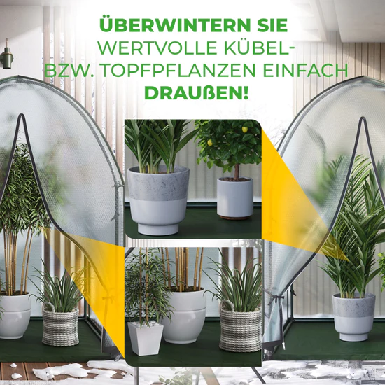 Das Überwinterungszelt ist die perfekte Lösung zur Überwinterung Ihrer mediterranen Kübelpflanzen im eigenen Garten, auf der Terrasse oder dem Balkon. Das Überwinterungszelt bietet Schutz vor Regen, Nässe, Wind, Kälte, Frost und Schnee. Das Zelt besteht aus einer langlebigen PVC-Gitterfolie und ist damit viele Jahre einsetzbar. Eine Fensteröffnung ermöglicht eine ausreichende Belüftung der Pflanzen. Zwei Eingänge sorgen für eine einfache Erreichbarkeit der Pflanzen, z.B. zum Gießen oder zur Schädlingskontrolle.Das Überwinterungszelt kommt in einer praktischen Tragetasche und lässt sich innerhalb einer halben Stunde aufbauen. Nach der Überwinterung lässt sich der Boden des Zeltes herausnehmen, so dient das Zelt als praktisches Gewächshaus für die Anzucht von Obst- und Gemüsepflanzen. Bei Nicht-Gebrauch lässt sich das Überwinterungszelt leicht transportieren und platzsparend verstauen.Bei sehr frostempfindlichen Kübelpflanzen, wie bspw. Zitruspflanzen, empfiehlt sich der Einsatz eines Frostwächters, der für eine gleichbleibende Temperatur sorgt und ihre wertvollen Pflanzen vor Frost schützt.Grundfläche: 130 cm x 130 cmHöhe: 150 cm