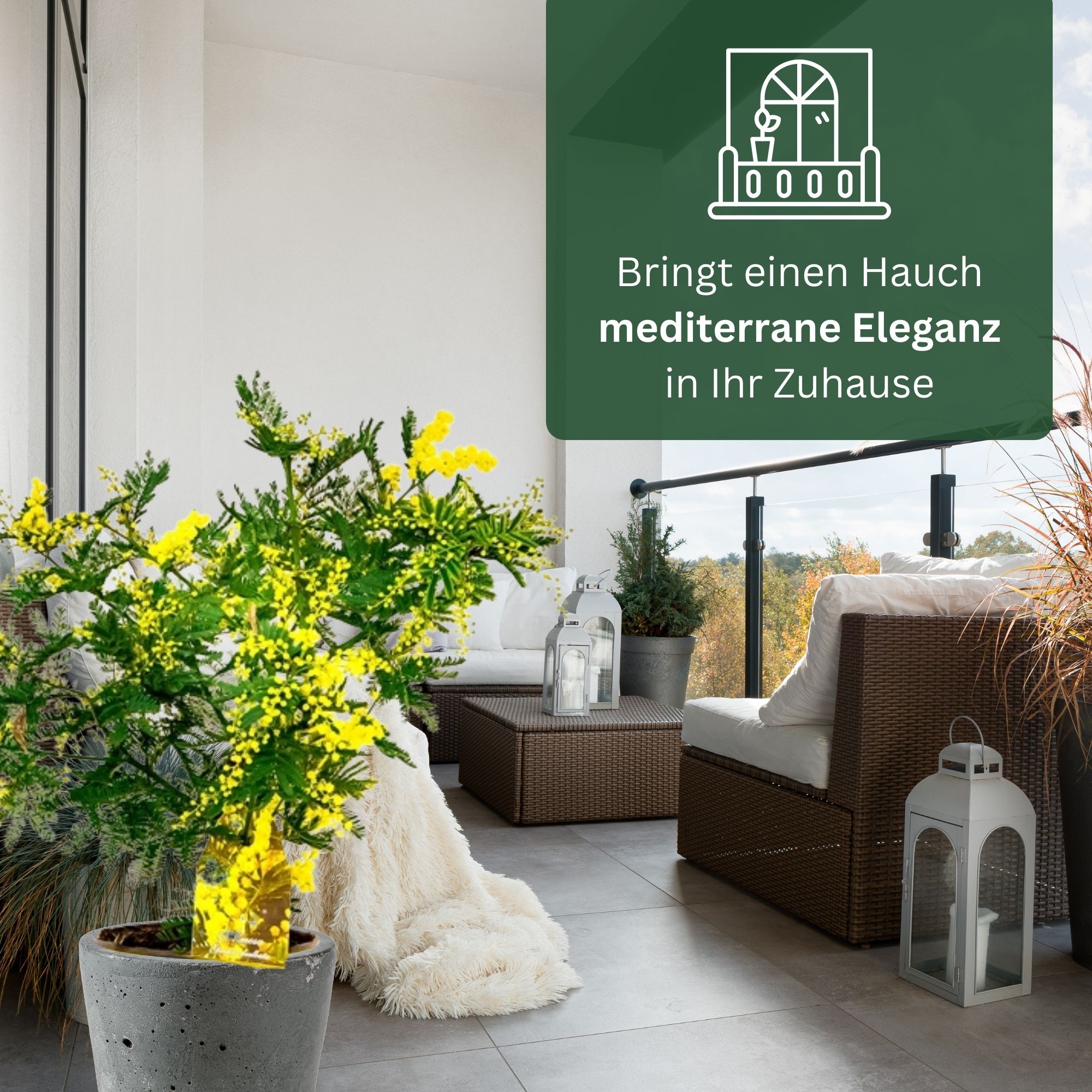 Die Wintermimose - Acacia dealbata 'Gaulois Astier' - ist ein immergrüner Baum mit auffälligem Laub und wunderschöner Winterblüte. Seine gefiederten silber-grünen Blätter sind auf Sizilien vielerorts zu sehen. Er blüht in strahlend gelber Farbe von Februar bis April. Die Silber-Akazie wird Wintermimose oder auch falsche Mimose genannt. Sie zählt zwar zu der Familie der Mimosengewächse, gehört aber der Gattung der Akazien an. Sie hat deshalb nicht die Eigenschaften der Pflanzenorgane und reagiert auch nicht auf Berührungen wie die echte Mimose (Mimosa pudica). Dafür ist sie wesentlich robuster und kann im fortgeschrittenen Alter auch leichte Fröste problemlos aushalten.