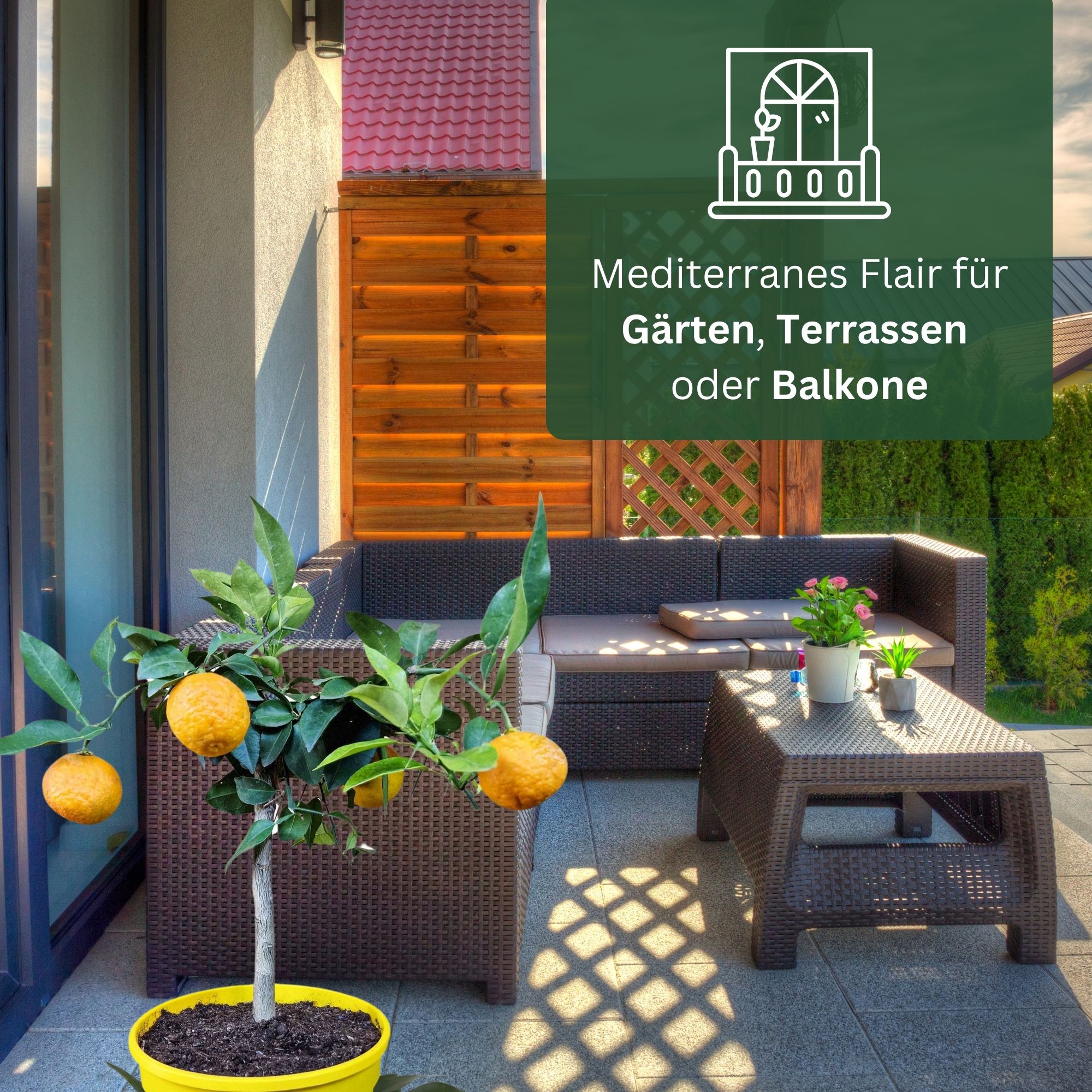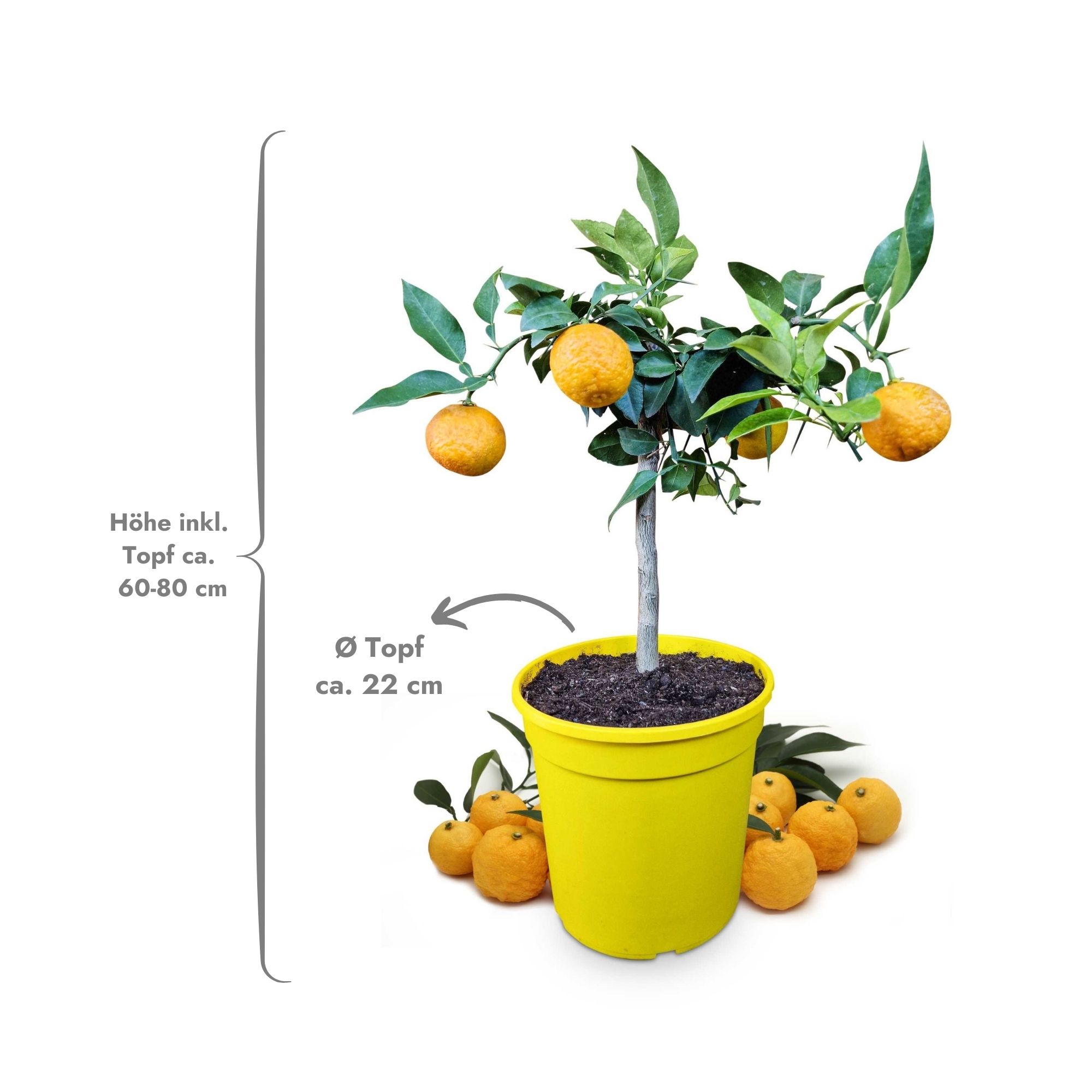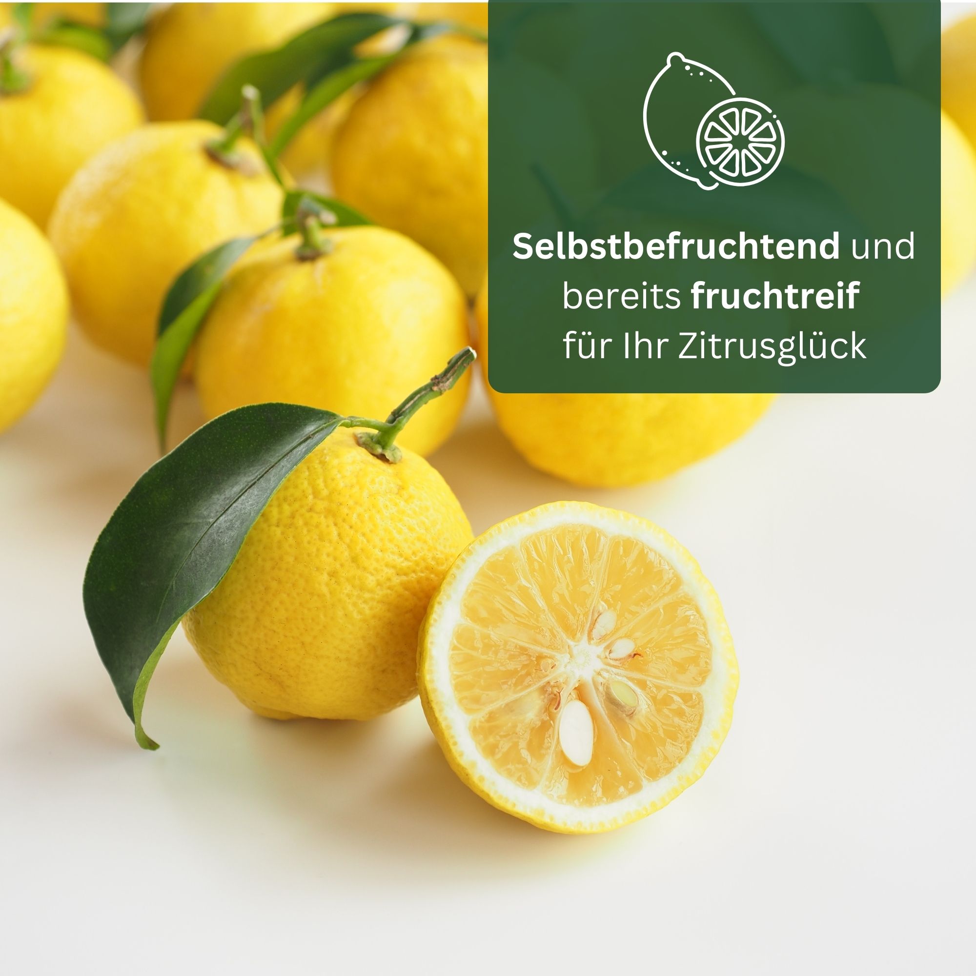 ACHTUNG: VORBESTELLUNGDIE AUSLIEFERUNG ERFOLGT IM MÄRZ 2026GENAUER LIEFERTERMIN WIRD IHNEN BEKANNT GEGEBEN - TERMINABSPRACHEN MÖGLICH BITTE NACH MÖGLICHKEIT TELEFONNUMMER ANGEBEN FÜR DIE AVISIERUNG DER SPEDITIONSLIEFERUNGYuzu - frostharte DelikatesseDie Yuzu (Botanisch: Citrus × junos = Citrus ichangensis × Citrus reticulata) ist eine für die japanische Küche sehr wichtige Zitruspflanze, den ihr Saft bereichert viele Rezepte, aber auch Konfitüre aus Yuzu Zitronen ist bekannt und beliebt. Auch für Fleisch, Suppen und Fischgerichte ist Yuzu eine besonders beliebte Zutat. Die mit Dornen besetzte Pflanze wird ausgepflanzt im Freien bis zu vier Meter hoch. Die Früchte haben eine dunkelgelbe, leicht schälbare Schale und können rund 100g schwer werden. Das Aroma der Yuzu ist sehr intensiv und komplex. Im Vergleich zu Zitronensaft ist der Yuzu-Saft weniger sauer. Neben der gastronomischen Nutzung, wird der Saft der Yuzu gerne bei der Parfum und Duftherstellung verwendet. Dank ihrer bemerkenswerten Frosthärte ist die Yuzu keine typische Zitruspflanze. Sie kann Frost noch besser verkraften als ihre asiatischen Verwandten Satsuma und Kumquat. In besonders milden Lagen kann die Yuzu sogar hierzulande im Garten ausgepflanzt werden. In den ersten Jahren ist jedoch ein zusätzlicher Frostschutz an kalten Wintertagen zu empfehlen.