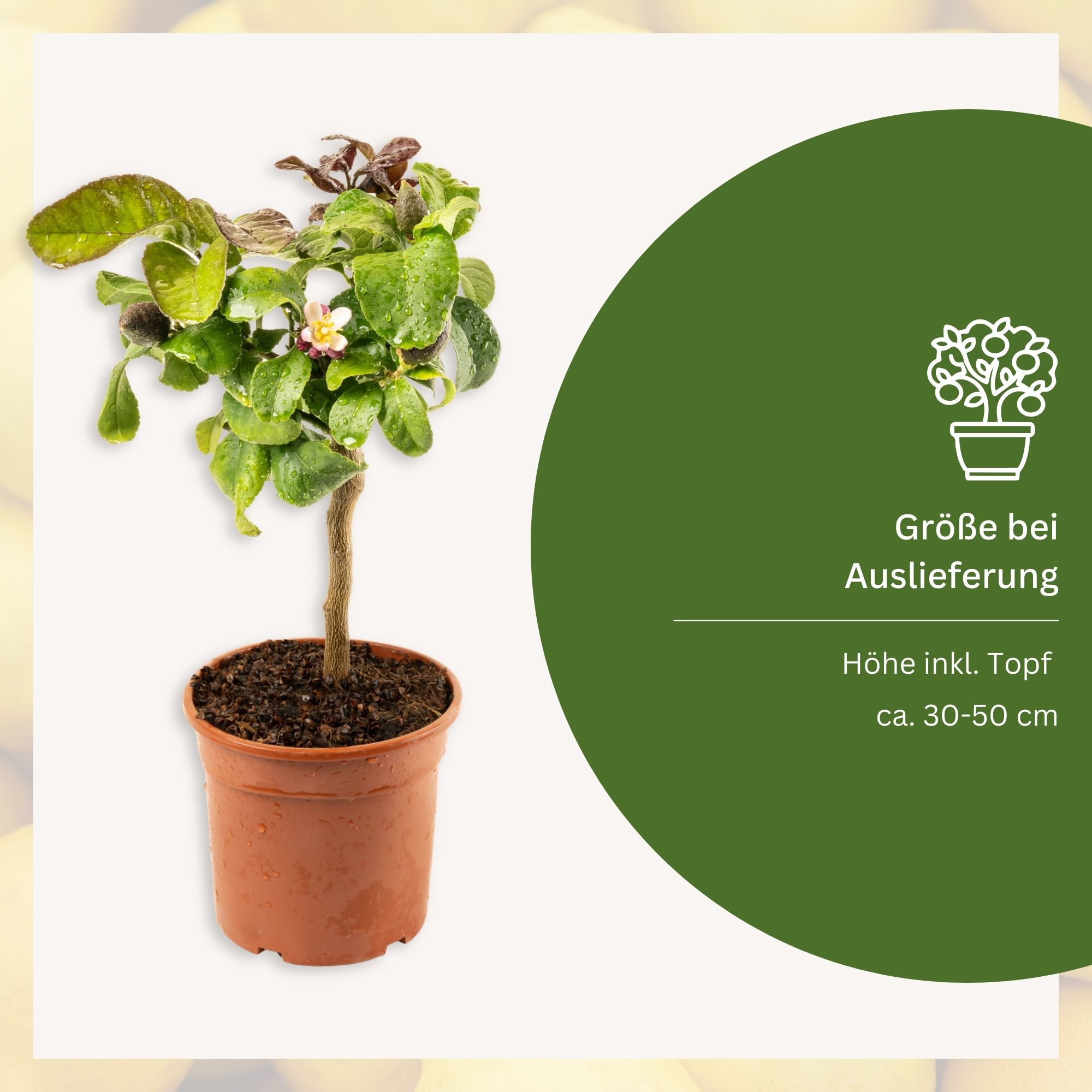 Erfüllen Sie sich den Traum vom Süden mit der Vier-Jahreszeiten-Zitrone! Dieser Zitronenbaum ist eine wahre Augenweide: Üppiges, immergrünes Blattwerk, zart violett-weiße Blüten mit herrlichem Duft und leuchtend gelbe Früchte machen ihn zum absoluten Hingucker auf Ihrer Terrasse oder Ihrem Balkon. Besonders beeindruckend: Dieser Baum trägt Blüten und Früchte gleichzeitig, das ganze Jahr über – eine Besonderheit, die ihn einzigartig macht!Die Vier-Jahreszeiten-Zitrone ist nicht nur dekorativ, sondern auch ein echtes Multitalent. Die aromatischen Früchte eignen sich hervorragend für köstliche Rezepte, während die Pflanze mit ihrem betörenden Duft ein mediterranes Ambiente schafft. Kinder können an diesem Baum spielerisch die Wunder der Natur entdecken.Mit ihren faszinierenden Farbvariationen und der leichten Pflege ist diese Zitrone ein perfektes Geschenk – für sich selbst oder für Menschen, die das Besondere lieben. Holen Sie sich dieses kleine Stück Paradies nach Hause!