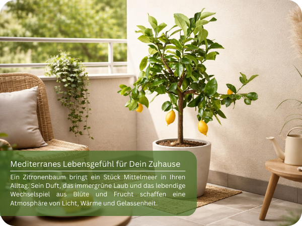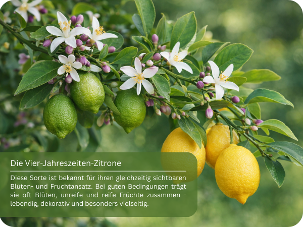 ACHTUNG: VORBESTELLUNGDIE AUSLIEFERUNG ERFOLGT Im MÄRZ 2026.GENAUER LIEFERTERMIN WIRD IHNEN BEKANNT GEGEBEN - TERMINABSPRACHEN MÖGLICH BITTE NACH MÖGLICHKEIT TELEFONNUMMER ANGEBEN FÜR DIE AVISIERUNG DER SPEDITIONSLIEFERUNGDie Vier-Jahreszeiten-Zitrone (Citrus limon) ist ein echter Klassiker unter den Zitruspflanzen und macht ihrem Namen alle Ehre: Sie kann das ganze Jahr über blühen und fruchten, sodass Blüten, junge und reife Früchte oft gleichzeitig am Baum zu sehen sind. Ein dauerhaftes Schauspiel aus Duft, Farbe und mediterraner Lebenskraft.Die Sorte überzeugt durch ihr kräftiges Wachstum, ihren kompakten Wuchs und ihre hohe Blühfreude. Ihre Früchte sind leuchtend gelb, mittelgroß und besitzen ein besonders intensives, frisches Zitronenaroma.Der Zitronenbaum ist immergrün, bildet das ganze Jahr über neue Blätter und sorgt mit seinem angenehmen Duft für Urlaubsstimmung im eigenen Zuhause.Besonderheiten:🌸 Blüht und fruchtet nahezu das ganze Jahr über🍋 Mittelgroße, saftige Früchte mit intensivem Aroma💚 Kompakter, immergrüner Wuchs – ideal für Balkon oder Terrasse🌞 Sehr blühfreudig und robust🕰️ Besonders langlebig und pflegeleicht