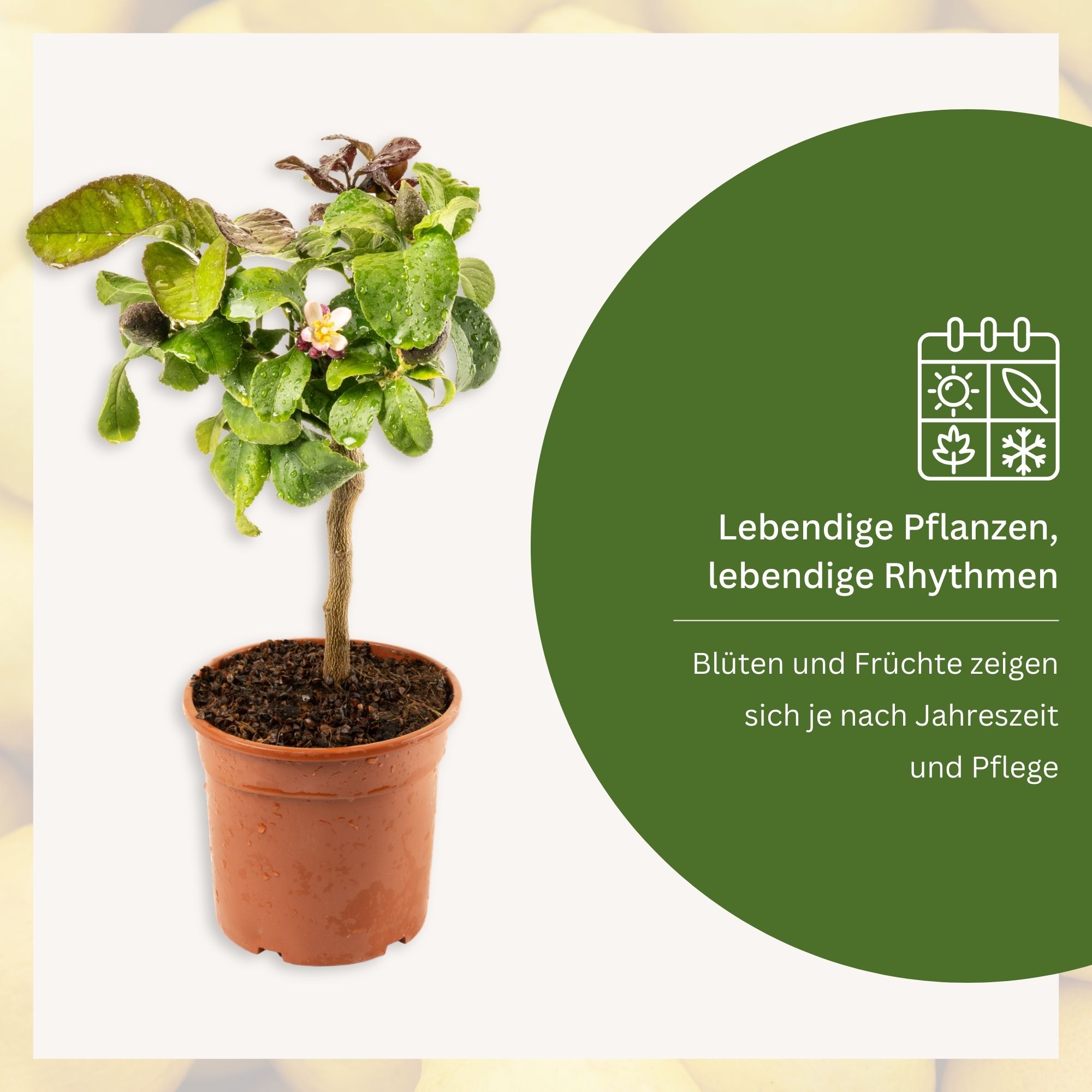 Die Vier-Jahreszeiten-Zitrone (Citrus limon) ist ein echter Klassiker unter den Zitruspflanzen und macht ihrem Namen alle Ehre: Sie kann das ganze Jahr über blühen und fruchten, sodass Blüten, junge und reife Früchte oft gleichzeitig am Baum zu sehen sind. Ein dauerhaftes Schauspiel aus Duft, Farbe und mediterraner Lebenskraft.Die Sorte überzeugt durch ihr kräftiges Wachstum, ihren kompakten Wuchs und ihre hohe Blühfreude. Ihre Früchte sind leuchtend gelb, mittelgroß und besitzen ein besonders intensives, frisches Zitronenaroma.Der Zitronenbaum ist immergrün, bildet das ganze Jahr über neue Blätter und sorgt mit seinem angenehmen Duft für Urlaubsstimmung im eigenen Zuhause.Besonderheiten:🌸 Blüht und fruchtet nahezu das ganze Jahr über🍋 Mittelgroße, saftige Früchte mit intensivem Aroma💚 Kompakter, immergrüner Wuchs – ideal für Balkon oder Terrasse🌞 Sehr blühfreudig und robust🕰️ Besonders langlebig und pflegeleicht