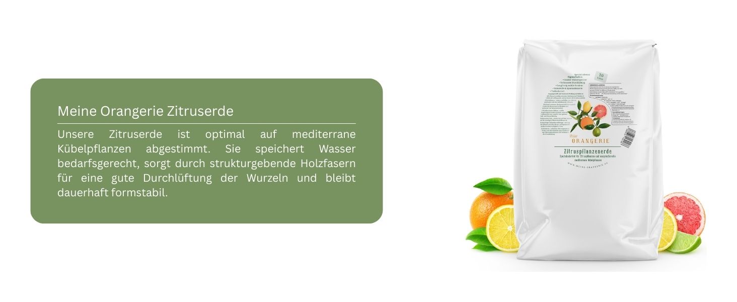 Unsere Spezialerde für anspruchsvolle mediterrane Kübelpflanzen Grundpreis pro Liter: 0,79 € inkl. MwSt STARKER WASSERSPEICHER - Nicht zuviel und nicht zu wenig! Unsere Erde für Zitruspflanzen speichert die richtige Menge an Wasser für Ihren Zitrusbaum, Olivenbaum oder mediterrane Palme VERBESSERTE DURCHLÜFTUNG - Wurzeln von Zitrus, Oliven, Oleander, Bougainvillea und Co. benötigen Lufttaschen in der Kübelerde um optimal zu funktionieren. Holzfasern lockern und lüften das Substrat und fördern die Wurzelbildung LANGFRISTIG STABILE STRUKTUR - Zitruspflanzenerde und mediterrane Erde braucht dauerhafte Strukturstabiliät. Die spezielle Rezeptur unserer Kübelpflanzenerde bietet dies trotz reduzierten Torfanteils. NÄHRSTOFFE & PH-WERT - Die Citrus-Erde ist mit kohlensaurem Kalk und hochwertigem Mehrnährstoff-Dünger perfekt abgestimmt auf Ihren Zitronenbaum, Limetten Baum und andere Citruspflanzen [ph-Wert = 5,6] VIELSEITIG EINSETZBAR - Egal ob als Palmenerde, Olivenbaumerde, oder Anzuchterde für ein kleines Zitronenbäumchen aus dem Samen. Unsere Blumenerde bietet günstige Voraussetzungen für gesunde Pfanzen mit sattgrünen Blättern und vielen Früchte. Ausgangsstoffe und Zusätze & Wirkung im Substrat 40% Wenig bis mäßig zersetzter Hochmoortorf (Weißtorf) - erhöht die Luftkapazität und verbessert die Strukturstabilität 25% Holzfasern - lockern und lüften das Substrat und fördern die Wurzelbildung der Pflanzen 20% Stark zersetzter Hochmoortorf (Schwarztorf) - erhöht die Wasserspeicherfähigkeit und verbessert die Wasseraufnahme 15% Gebrochener Blähton - erhöht langfristig die Strukturstabilität sowie die Luftkapazität und sorgt für eine optimale Luft- und Wasserführung Kohlensaurer Kalk - stimmt den pH-Wert optimal auf die jeweiligen Pflanzenbedürfnisse ab Hochwertiger Mehrnährstoffdünger - versorgt die Pflanzen mit allen Haupt- und Spurennährstoffen in sofort verfügbarer Form Trichoderma - natürliche Mikroorganismen. Fördern die Abwehrkräfte gegen bodenbürtige Pflanzenkrankheiten und verbessern die Wurzelbildung Warendeklaration: Kultursubstrat: unter Verwendung von organischem Bodenmaterial (Hochmoortorf, wenig bis mäßig und stark zersetzt, H2-H8), Ton (Blähton), DüngemittelnVolumen: 10 LiterInverkehrbringer: Meine Orangerie Vertriebs GmbH – Burgstr. 49 – 53332 BornheimRezeptur:pH-Wert * (CaCl2): 5,6 Salzgehalt * (g/l) 1,2 N-Stickstoff * (CaCl2) 210 mg/lP2O5 -Phosphat * (CAL) 120 mg/l K2O-Kalium * (CAL) 260 mg/lStruktur: mittelPG-Mix 18-10-20 1,20 kg/m³Zitruserde - die Vorteile:Die Zitruserde ist speziell auf die Bedürfnisse von Zitruspflanzen abgestimmt und hilft Ihnen, Ihre Zitruspflanzen perfekt zu pflegen. Die Zitruserde besitzt eine optimale Wasseraufnahme, auch nach längerer Trockenheit. Sie bietet für sechs bis acht Wochen eine gute Nährstoffversorgung, insbesondere ein angepasster Eisengehalt führt zu schönem, kräftig dunkelgrünem Laub. Ein in der Erde enthaltenes Tongranulat sorgt für ideale Luft- und Wasserdurchlässigkeit. Wenn sechs Wochen nach dem Umtopfen verstrichen sind, sollten Sie die Pflanze wieder mit Zitruszauber düngen, da dann der Nährstoffgehalt der neuen Zitruserde deutlich abnimmt. Stellen Sie den Topf auf Topffüße, damit das Wasser gut ablaufen kann. Wenn die Pflanze im Winterquartier in geschlossenen Räumen steht, müssen Sie unter Umständen auf eine Unterschale zurückgreifen. Achten Sie dann darauf, dass das Wasser nicht in der Unterschale stehen bleibt, auch das würde wieder zu Staunässe führen. Wenn Sie Ihre Zitruspflanzen regelmäßig mit guter Zitruserde umpflanzen, werden Sie gerade bei den schnellwüschigen Sorten wie Zitronen, Orangen oder Mandarinen sehen, wie schnell die Pflanzen zu stattlichen Expemplaren heranwachsen, die Ihnen jedes Jahr im Herbst und Winter eine tolle Zitruserde bescheren. Bei Zitruspflanzen und Zitruserde ist es wie beim Hausbau: Am wichtigsten ist das Fundament.