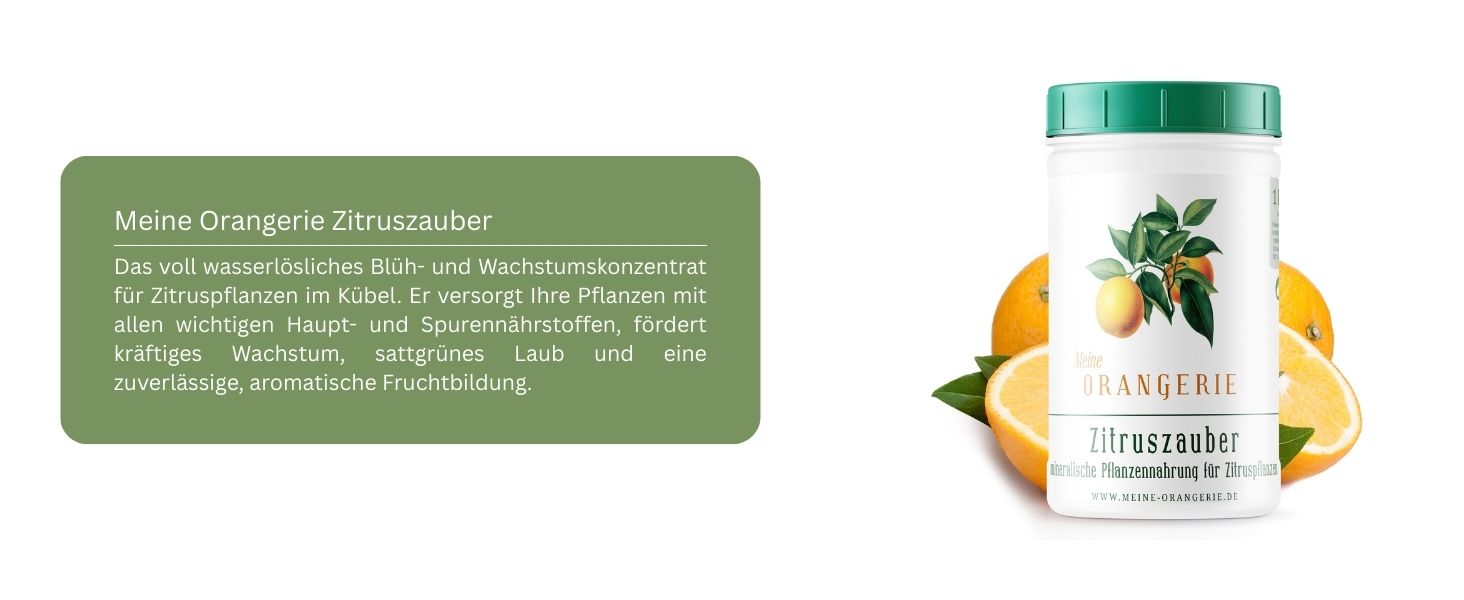 Von Frühjahr bis Herbst befindet sich die Pflanze in ihrer aktiven Wachstumsphase und sollte regelmäßig gedüngt werden. Der Meine Orangerie Zitruszauber Spezialdünger versorgt sie mit allen wichtigen Haupt- und Spurennährstoffen für kräftiges Wachstum, glänzende Blätter und aromatische Früchte.