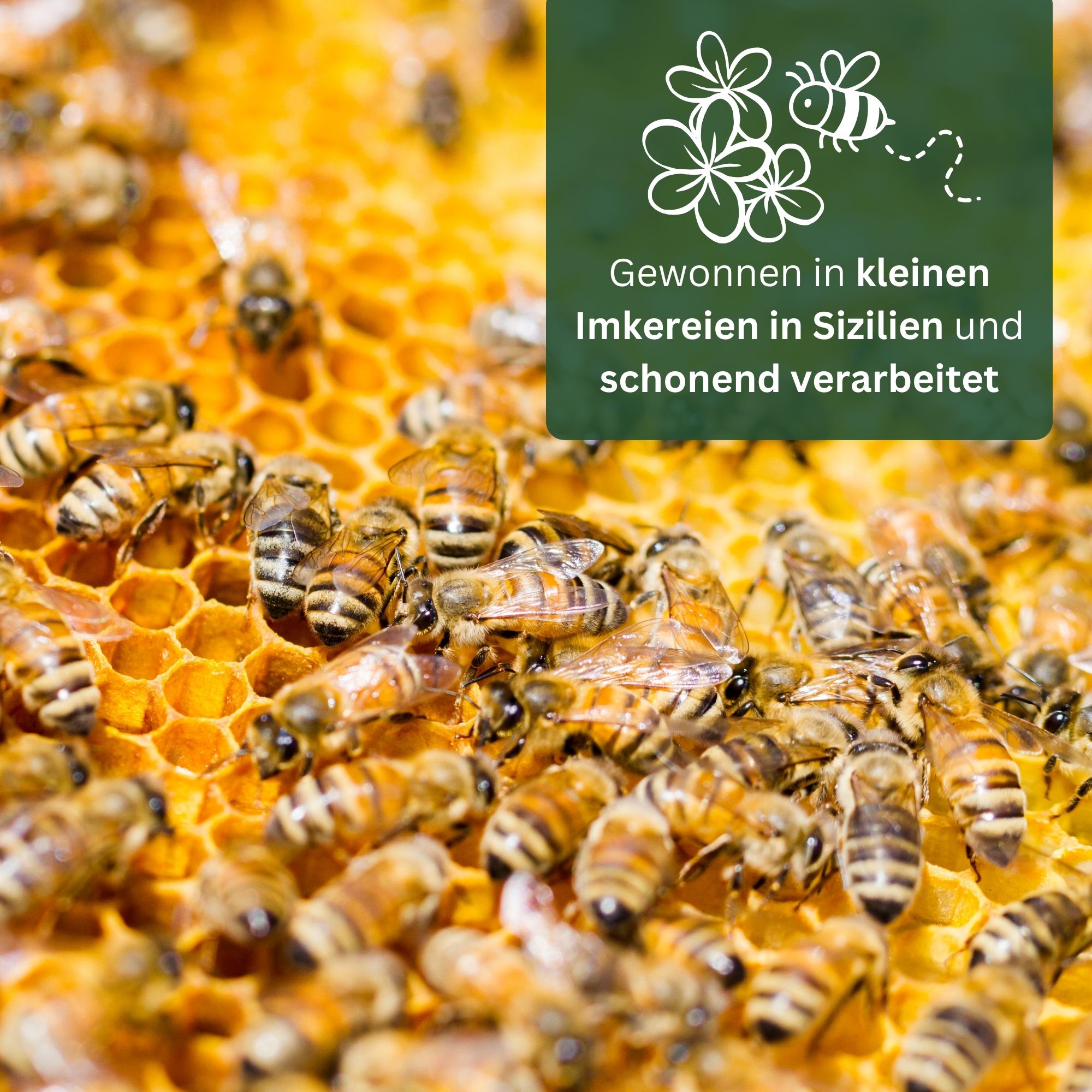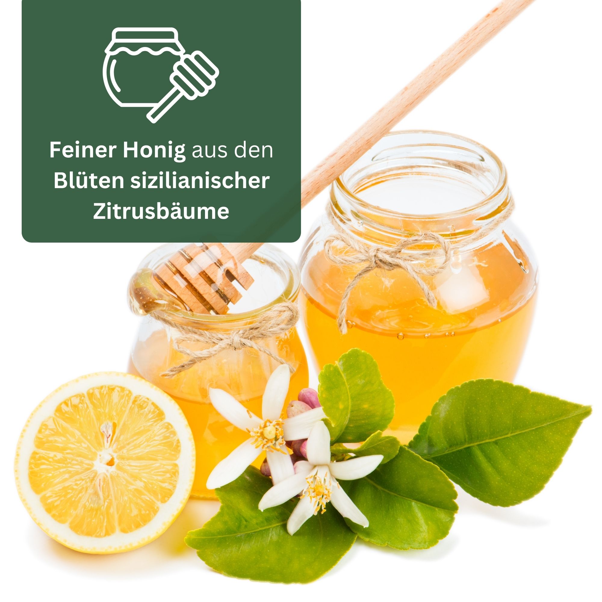 Der Miele di Agrumi wird aus dem Nektar sizilianischer Zitrusblüten gewonnen – Orangen, Mandarinen und Zitronen, die in den sonnenverwöhnten Plantagen rund um die Küste und im Landesinneren blühen. Sein Geschmack ist zart, floral und leicht fruchtig, mit einer feinen Zitrusnote, die typisch für Honig aus Süditalien ist.