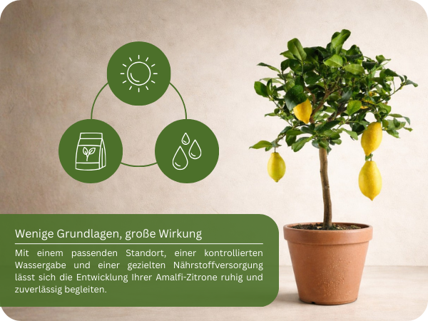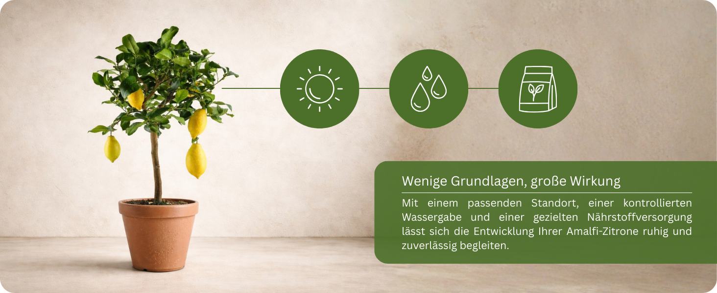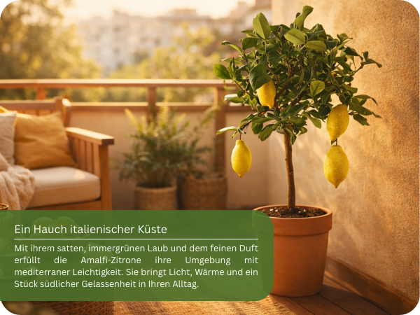 Der Amalfi Zitronenbaum liebt Sonne, Wärme und frische Luft – ganz wie in seiner mediterranen Heimat. Ein vollsonniger Standort ist ideal, damit Blätter, Blüten und Früchte ihr volles Aroma entwickeln können.