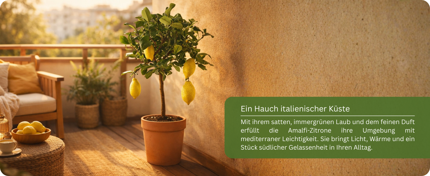 Der Amalfi Zitronenbaum bringt mediterranes Flair und sonnige Lebensfreude direkt zu Ihnen nach Hause. Mit seinem dichten, glänzend grünen Laub, den duftenden weißen Blüten und den großen, aromatischen Früchten ist er ein echter Blickfang auf Balkon, Terrasse oder im Wintergarten.