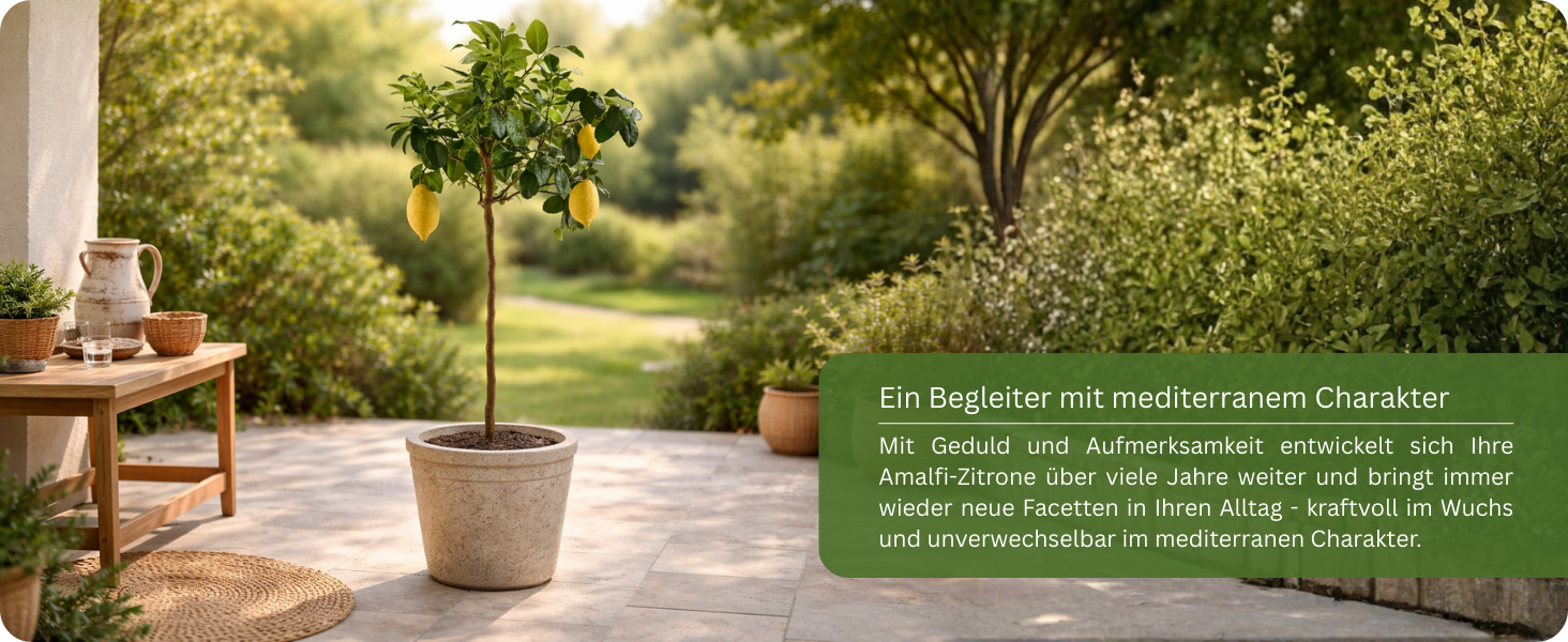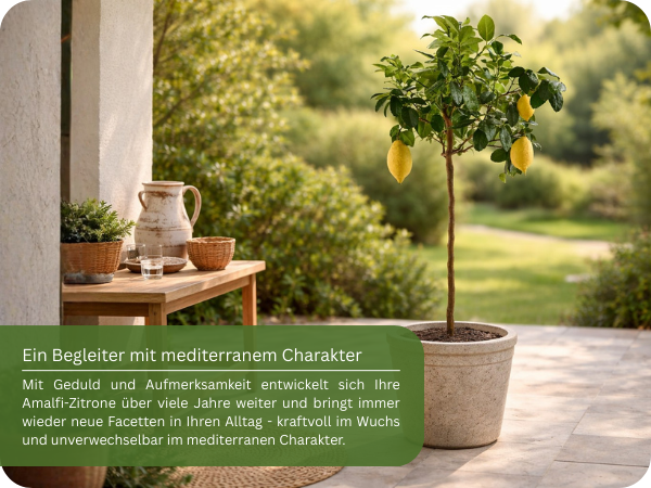 Der Amalfi Zitronenbaum ist eine immergrüne, mehrjährige Pflanze, die bei richtiger Pflege viele Jahre vital bleibt und regelmäßig Früchte trägt. Er bevorzugt sonnige, geschützte Standorte und eignet sich hervorragend als Kübelpflanze für Balkon oder Terrasse.