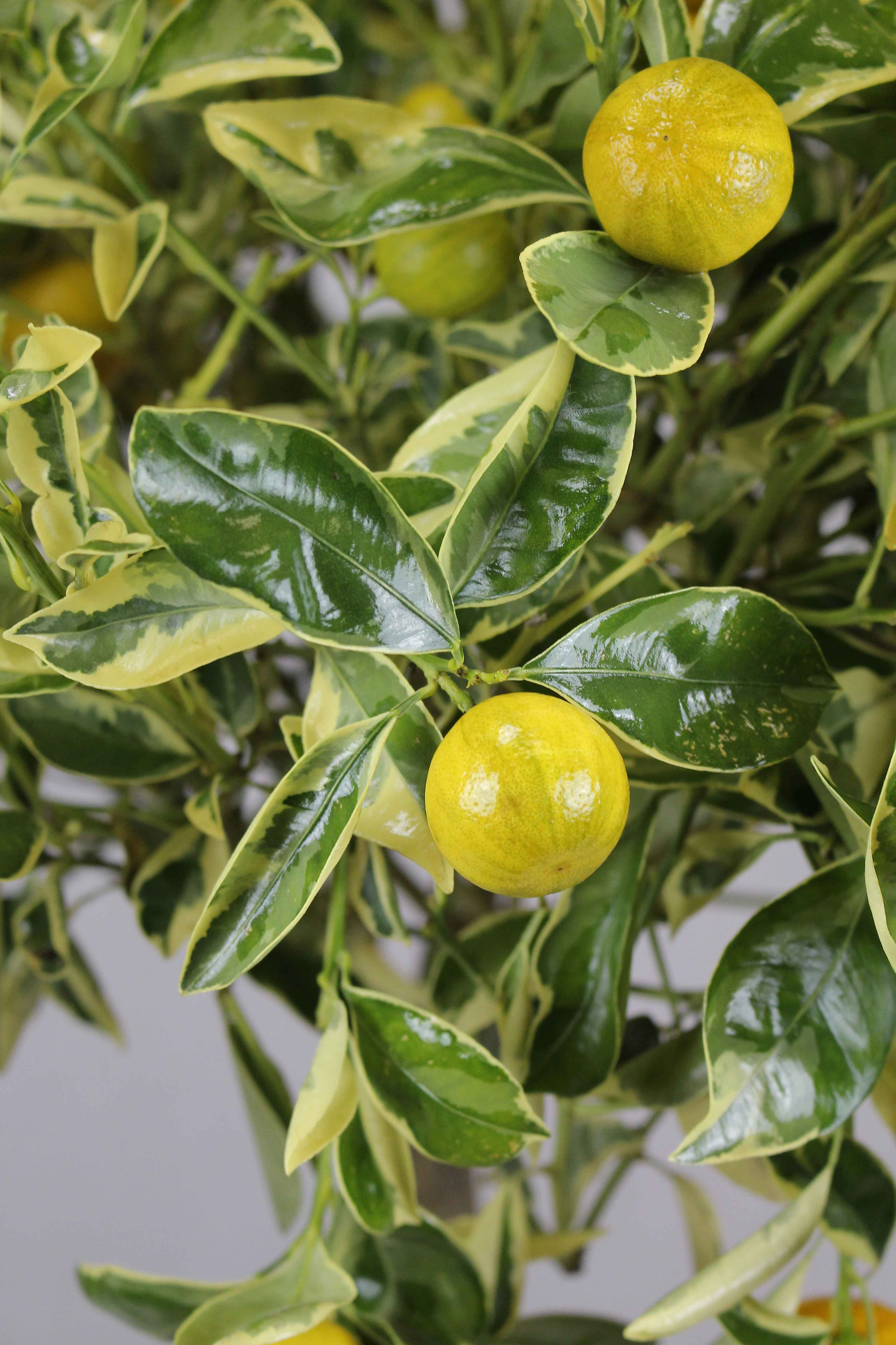 Diese außergewöhnliche Variante der klassischen Calamondin begeistert nicht nur durch ihre duftenden, weißen Blüten und die leuchtend orangefarbenen Früchte, sondern vor allem durch ihr attraktiv buntes Laub:
