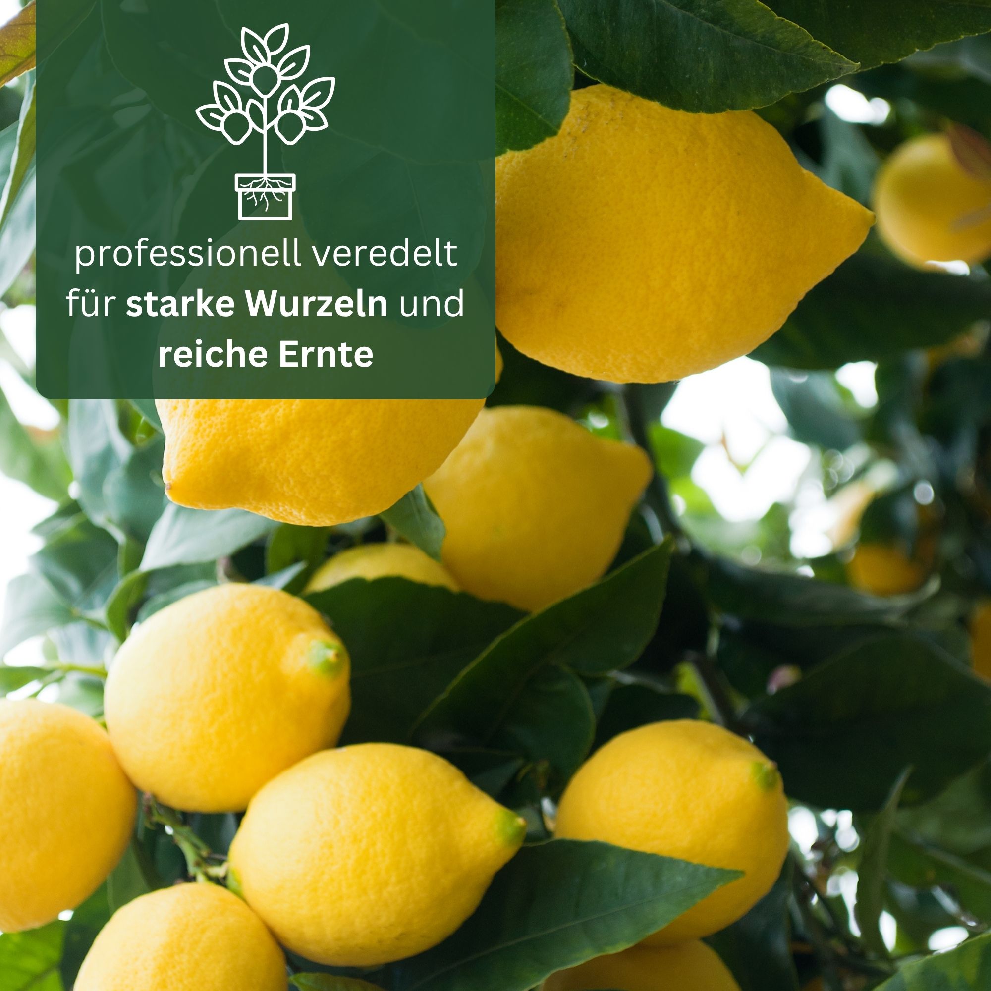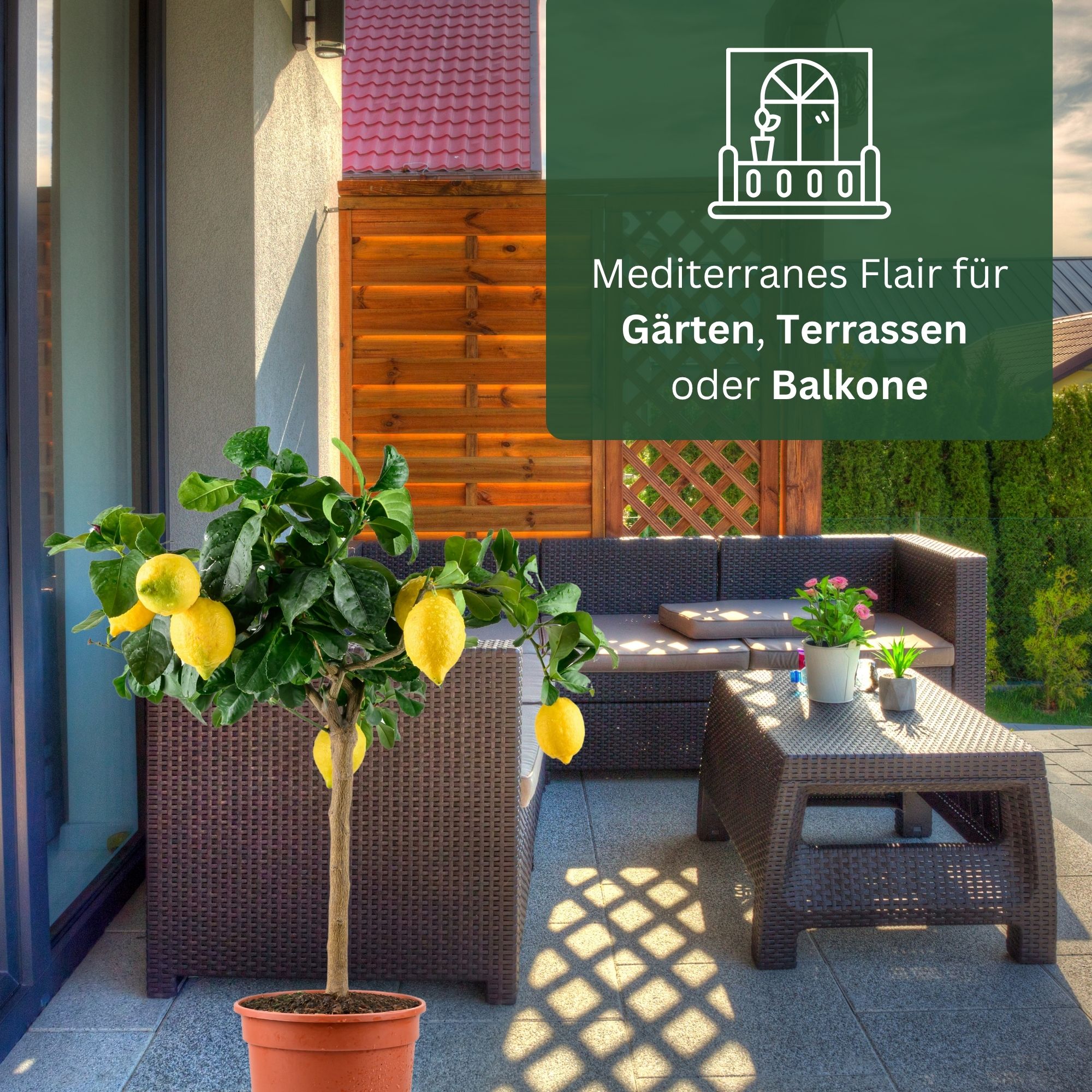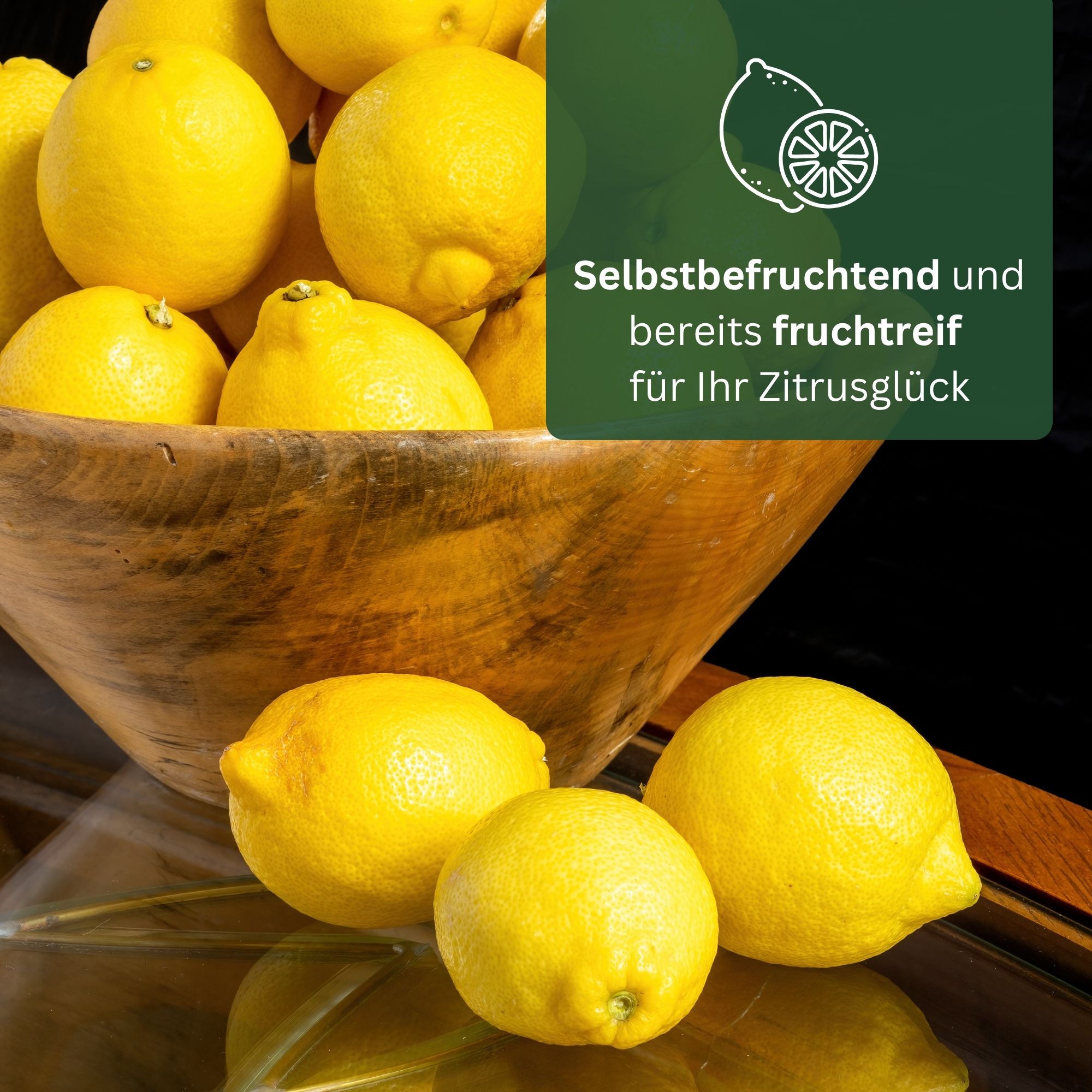 Die Meyer-Zitrone (Citrus limon 'Meyeri') ist eine ganz besondere Zitrussorte, die den Charme der klassischen Zitrone mit der Süße der Orange verbindet. Sie entstand vermutlich als natürliche Kreuzung aus Zitrone und Mandarine oder Orange – und genau das macht sie so beliebt.Ihre Früchte sind etwas runder, dünnschaliger und aromatischer als die herkömmlicher Zitronen. Das Fruchtfleisch ist mild-säuerlich, mit einer feinen, leicht süßlichen Note – perfekt zum Kochen, Backen und für frische Getränke. Die intensiv duftenden Blüten erscheinen mehrmals im Jahr und verströmen einen süß-zitronigen Duft, der jeden Raum erfüllt.Die Meyer-Zitrone wächst kompakt und buschig, trägt zuverlässig und ist auch für Einsteiger hervorragend geeignet. Sie gilt als besonders anpassungsfähig und robust, was sie zur idealen Zitruspflanze für Balkon, Terrasse oder Wintergarten macht.Besonderheiten:🍋 Milder, süßlich-zitroniger Geschmack🌸 Stark duftende Blüten – mehrmals im Jahr💚 Kompakter, buschiger Wuchs – ideal für kleinere Standorte🌞 Sehr blühfreudig und reich tragend🕰️ Pflegeleicht, robust und ertragreich