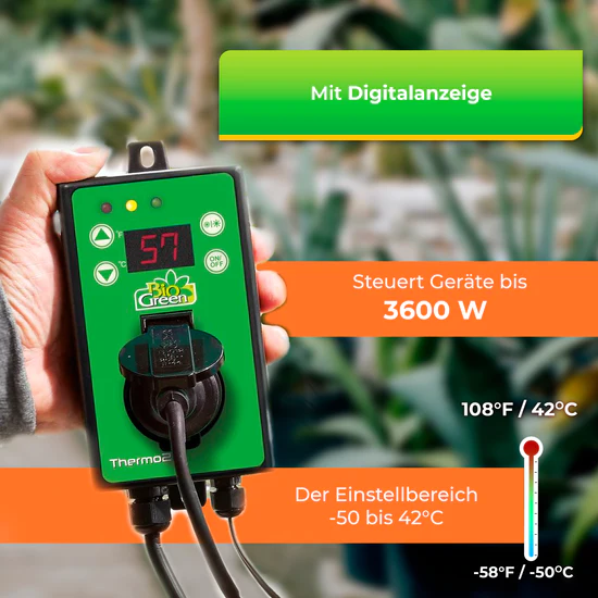 Behalten Sie die Temperatur in Ihrem Überwinterungszelt, dem Gewächshaus oder einem anderen Winterquartier Ihrer Kübelpflanzen immer im Auge - mit dem Digital-Thermostat von Meine Orangerie. Viele Kübelpflanzen müssen überwintert werden, da sie keinen Frost vertragen. Wenn Sie sich für die kalte Überwinterung in einem Gewächshaus oder einem Überwinterungszelt entschieden haben, fragen Sie sich sicher auch: Wann und wie lange muss die Heizung laufen, um das Winterquartier frostfrei zu halten, aber dennoch nicht zu viel zu heizen? Diese Aufgabe übernimmt ab sofort das Digital-Thermostat für Sie. Mit seinem 1,5 Meter langen Temperaturfühler misst das Thermostat konstant die herrschende Temperatur und temperiert das Winterquartier auf die von Ihnen eingestellte Raumtemperatur (Einstellbereich -50°C bis +99°C). Durch das bedarfsgerechte Heizen mit unserem Digital-Thermostat optimieren Sie den Energieverbrauch merklich.